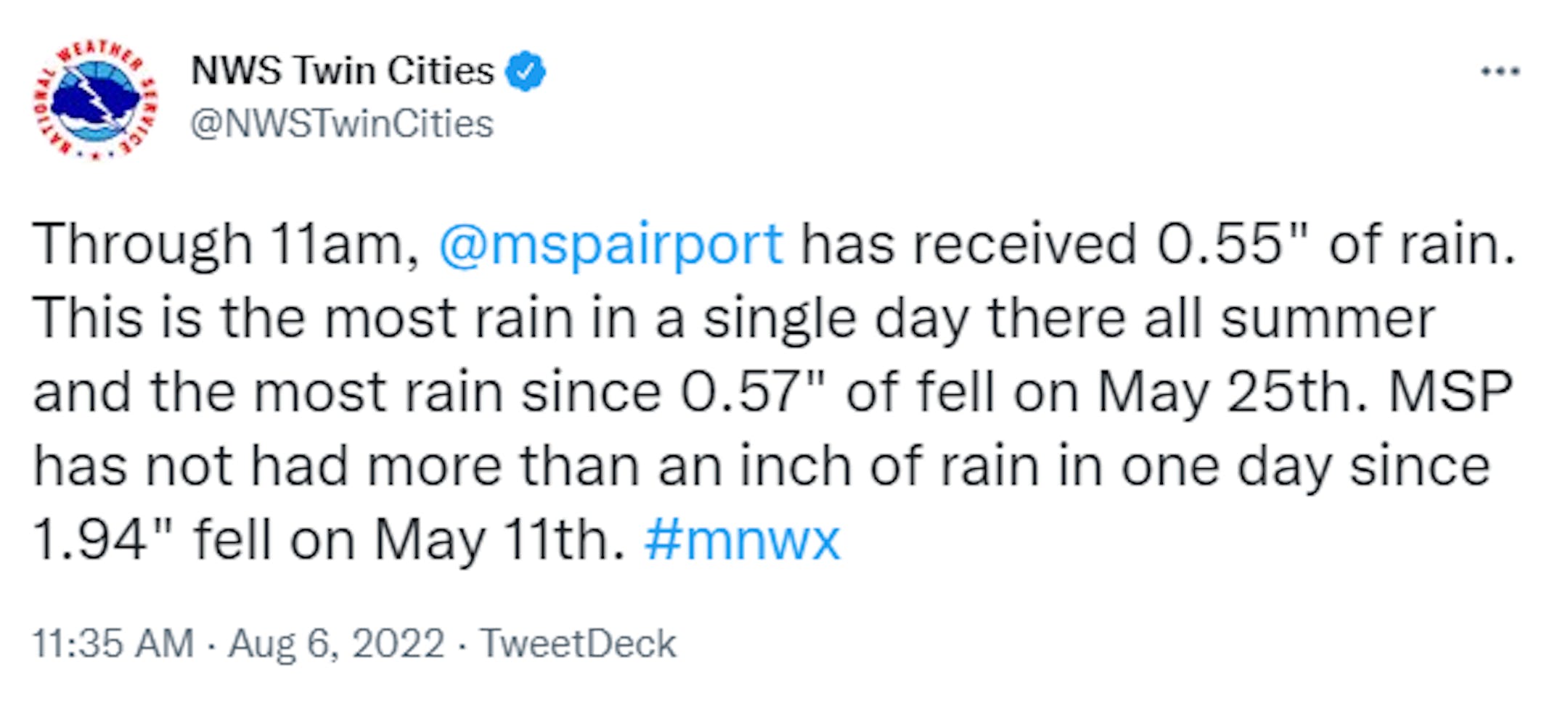 Interestingly, Saturday was one of the top 10 wettest days at MSP so far this year. The tweet below from the NWS Twin Cities suggested that 0.55" of rain had fallen at the MSP Airport through 11am, which was tied for the 8th wettest day so far this year.