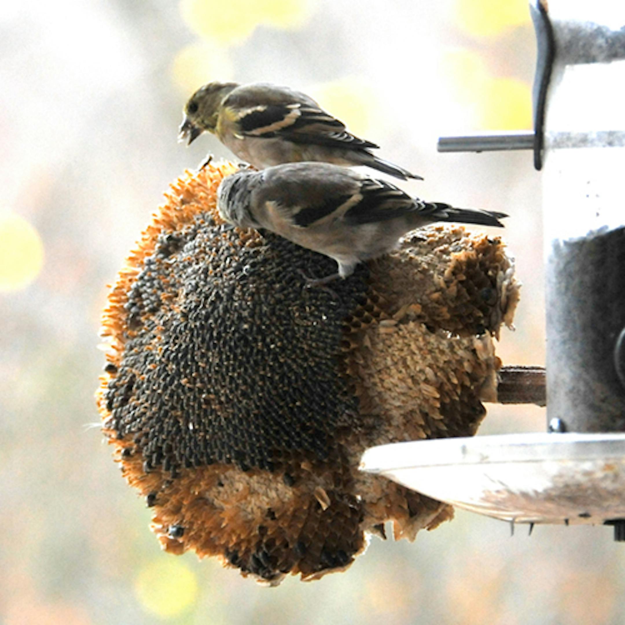 While in North Dakota last week I scavenged a half dozen sunflower heads, complete with seeds, from a harvested field. These were heads missed by the picker. I wish I had taken more. The finches at our feeders choose the heads first, at least this morning. We saw thousands of acres of sunflowers, about half harvested, in western North and South Dakota and eastern Montana. North Dakota had more by far. There were no birds to be seen in the unpicked fields, although flocks of thousands of Red-winged Blackbirds were seen in many places. Blackbirds are said by some growers to take up to 10 percent of black oil seeds before harvest. Horned Larks and unidentified sparrows were foraging in the debris of harvested fields.