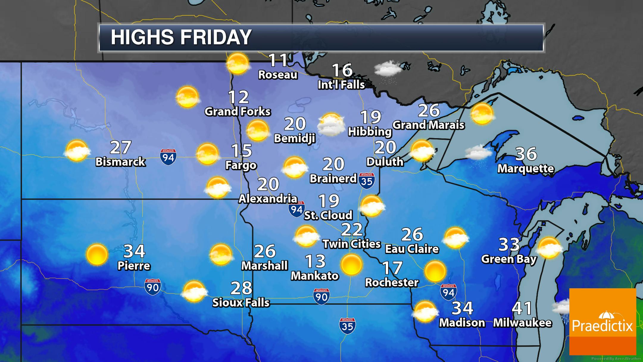 A mix of sun and clouds to mainly sunny skies are expected Friday across the state, with highs in the teens and 20s. These highs - for the most part - will be around average for the second to last day of the year.