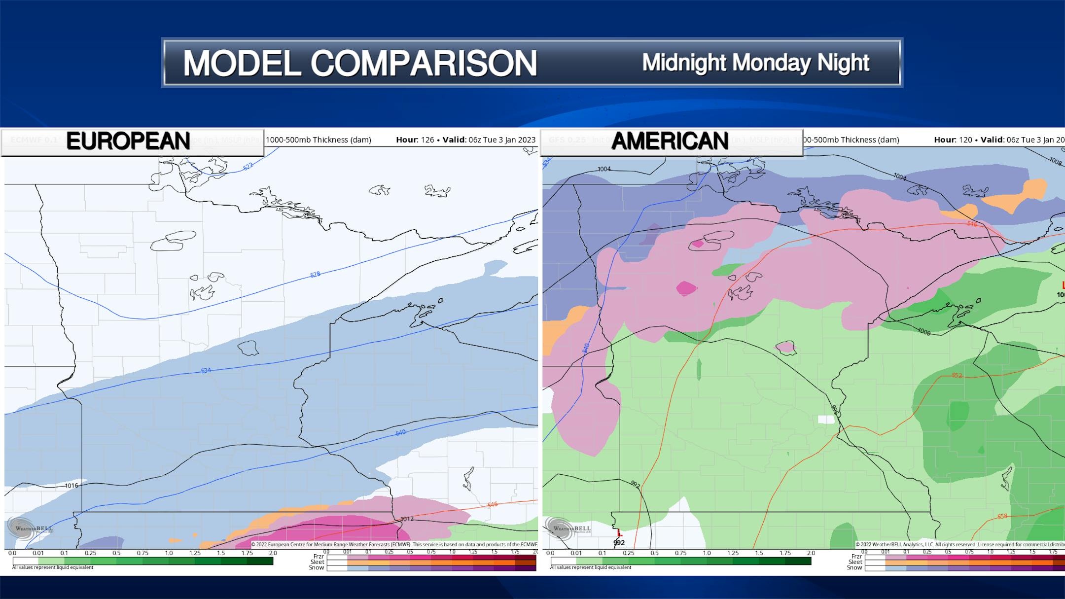 - The European model shows a more southern track, bringing the snow and ice chances across southern Minnesota with little to no precipitation north.