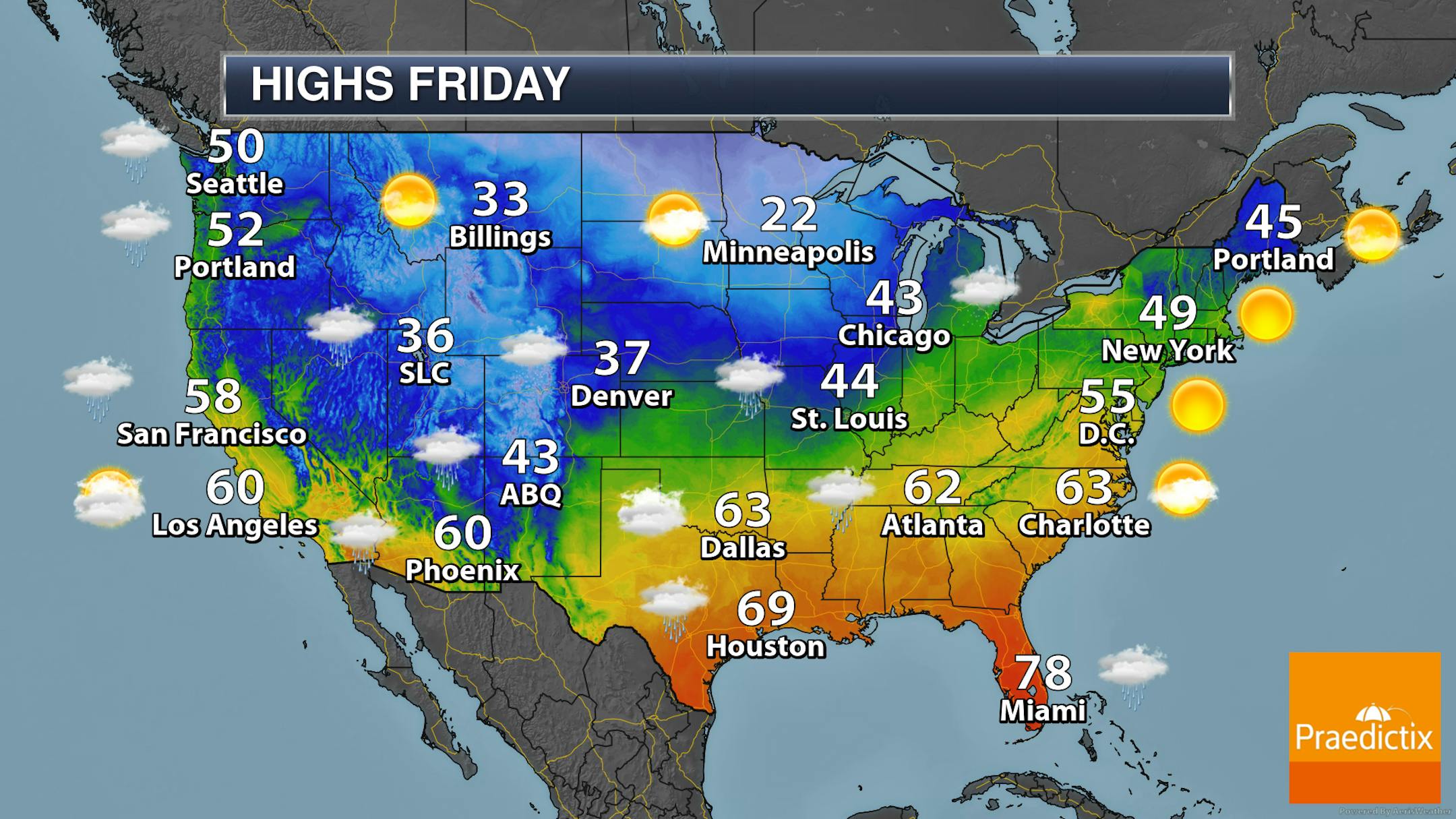 Friday will be a bit cooler than what we've seen the past couple of days as we'll be behind a cold front that brought us snow late Thursday into Thursday night. Morning temperatures will start off in the mid-teens with highs climbing into the low 20s. While skies will start off cloudy in the early morning hours, we should see sunny skies by the afternoon.