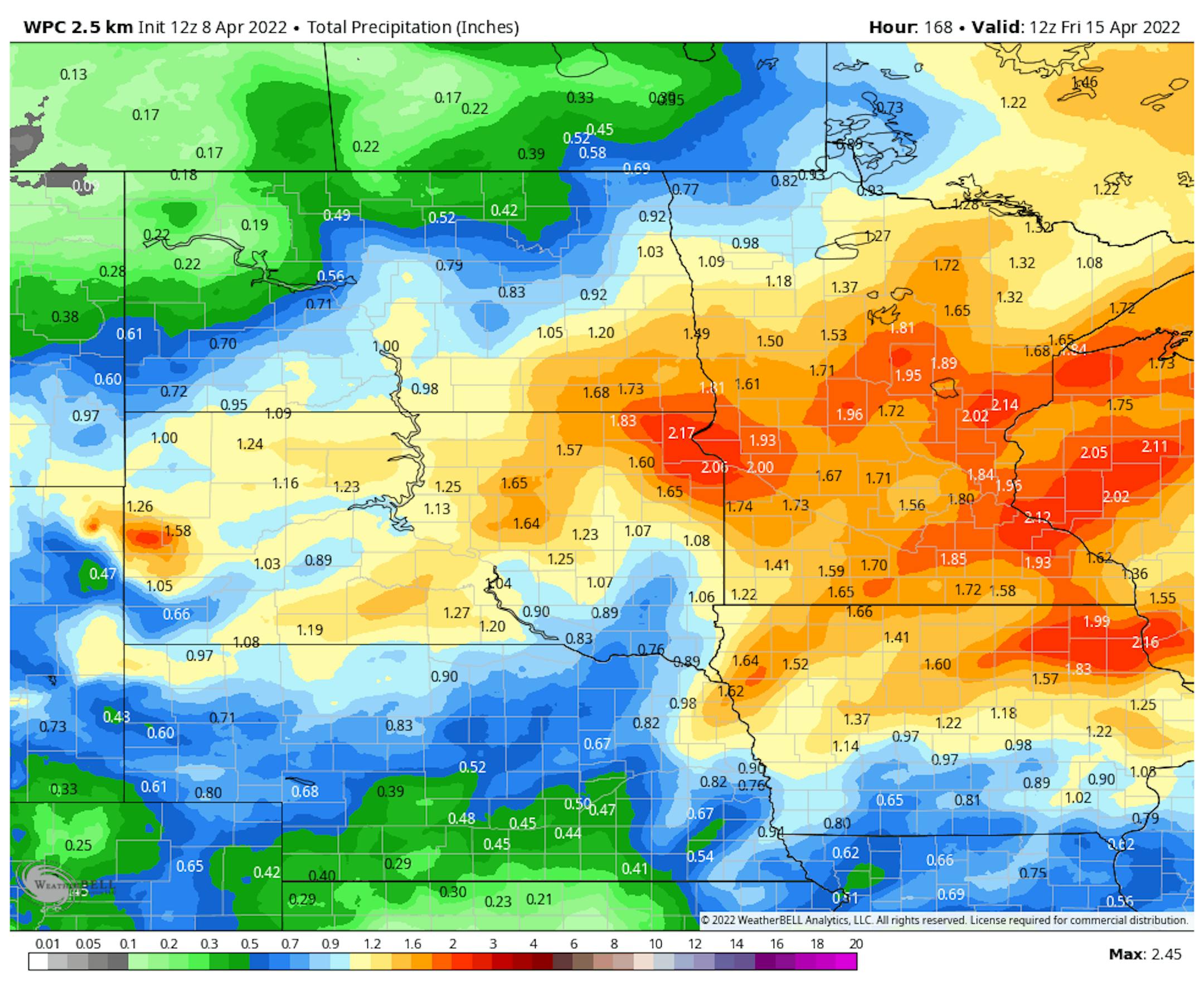 From Sunday through most of next week, we will watch several chances of precipitation across the upper Midwest, including here in the Twin Cities. The big story will be a mid-week system that could bring some heavy snow somewhere across the Northern Plains and into northwestern Minnesota, and heavier rain in southern Minnesota. Right now the potential exists for at least 1-2" of liquid precipitation (rain or melted wintry precipitation) across the state through Friday morning next week. As this event gets closer we'll have more details on what is expected, especially since it's several days out which means we will still see track changes, etc.