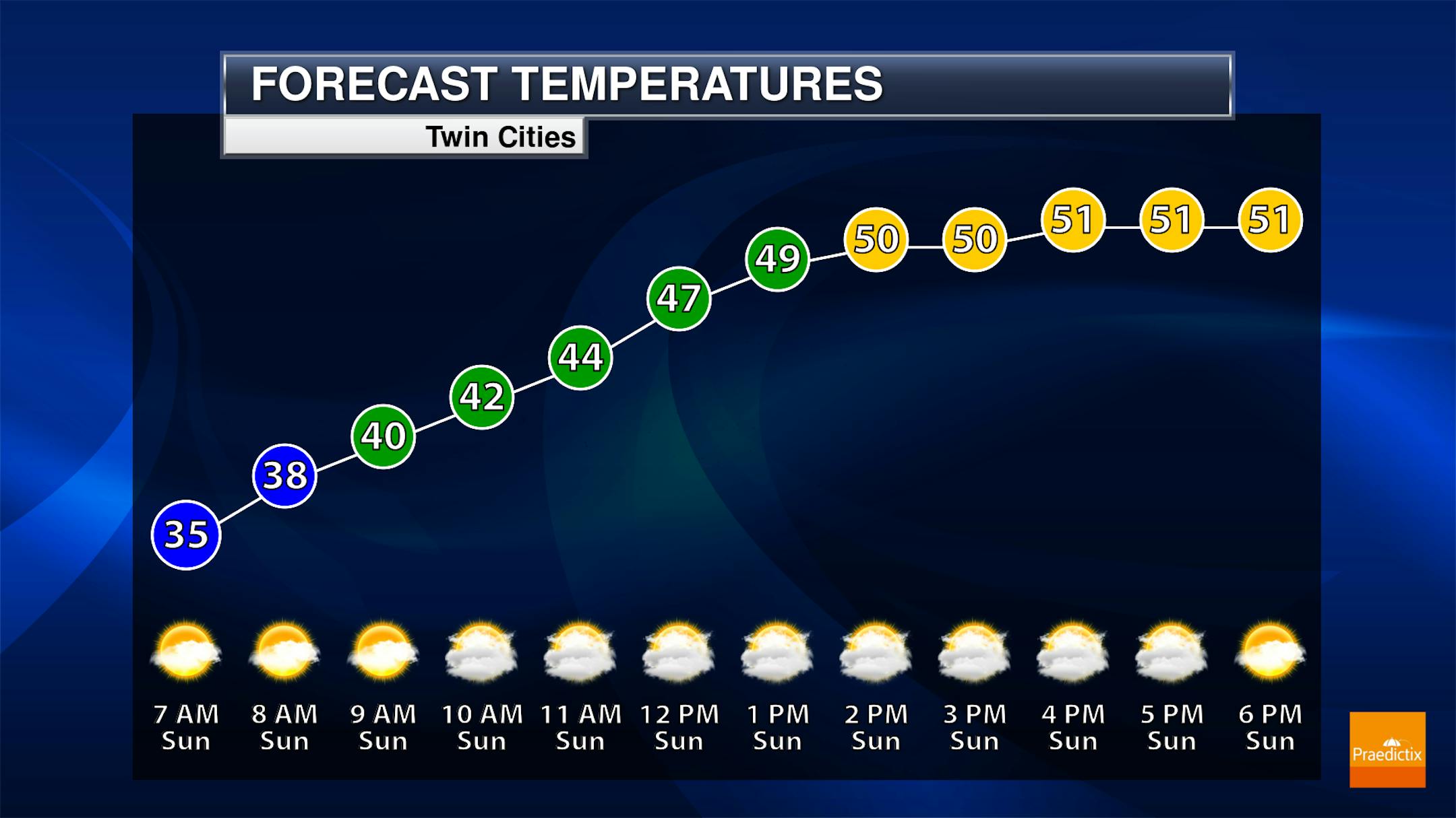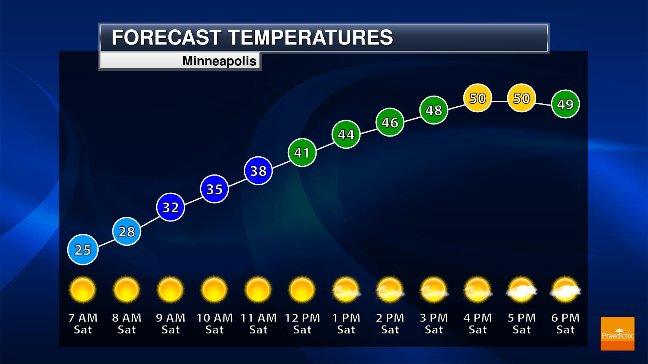 We won't see any precipitation issues on Saturday in the metro. While it'll be a chilly start with morning lows in the mid to upper 20s, we should see those temperatures climb up to around 50F late in the afternoon under mainly sunny skies for the second Twins game of the year.