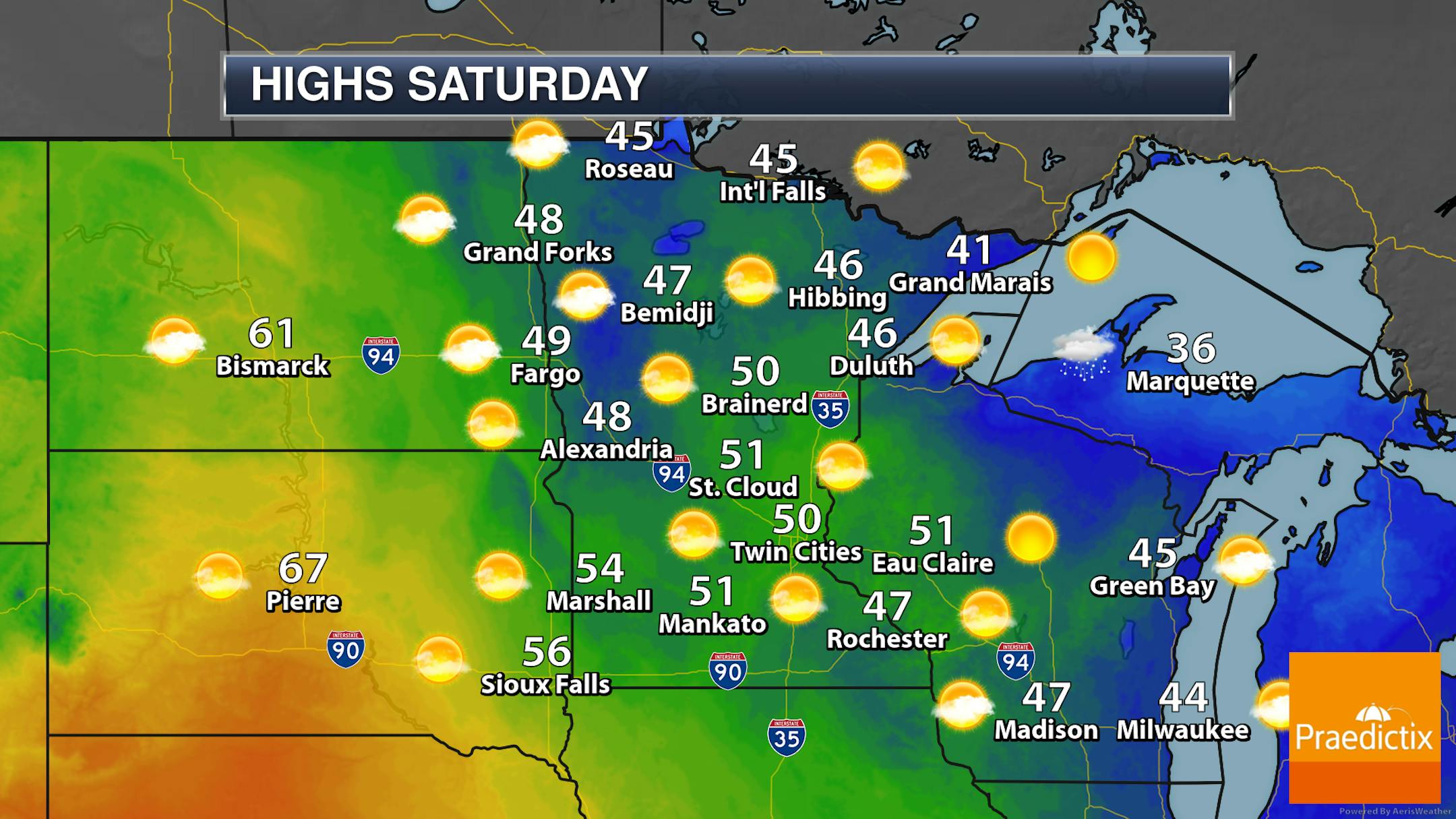 Highs will climb into the 40s and 50s across the state on Saturday under those mostly sunny skies. These highs will actually be within a few degrees of average! In the Twin Cities, the last time we were around the average was back on the 2nd, when the high was 50F (three degrees above average).