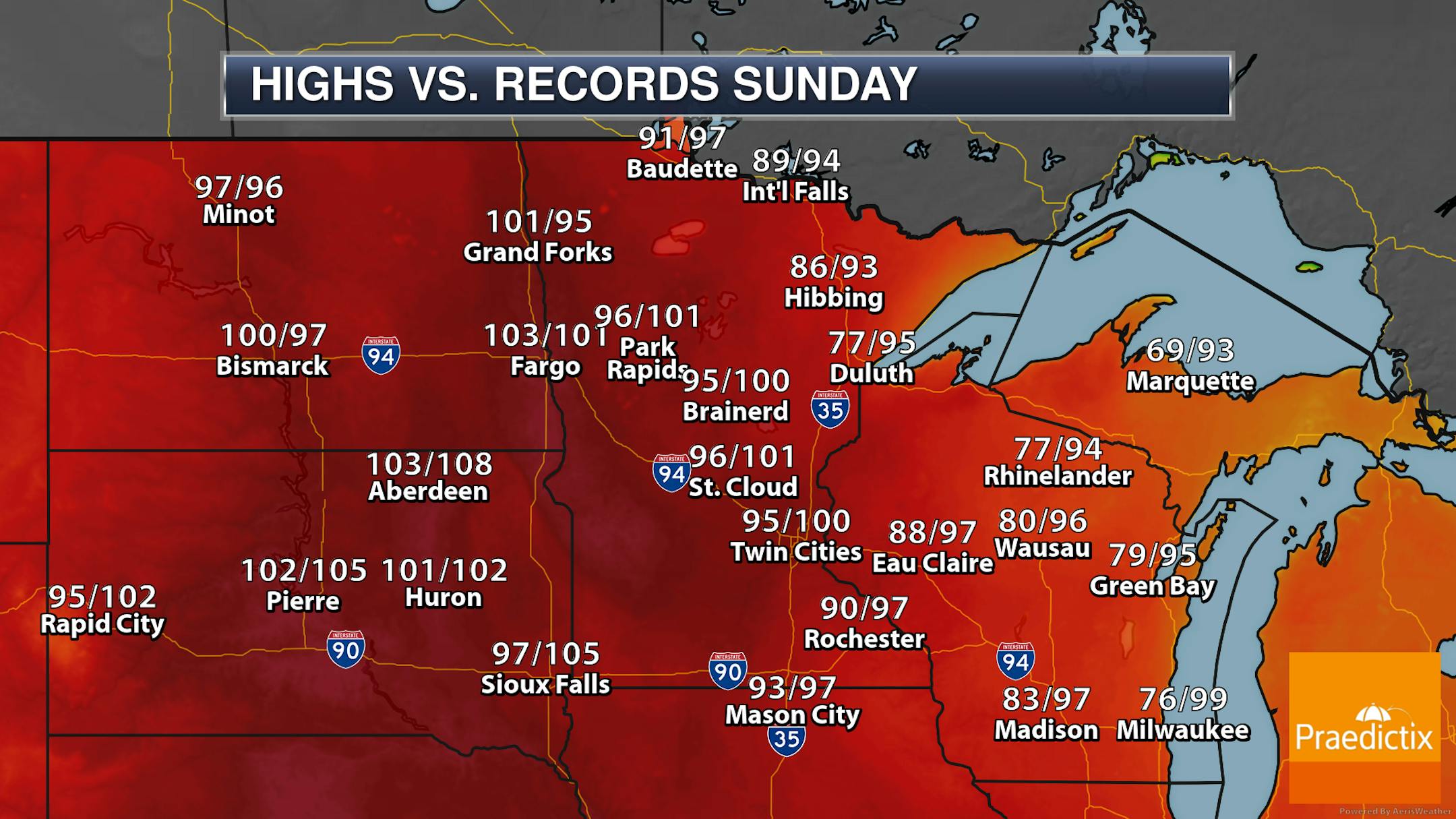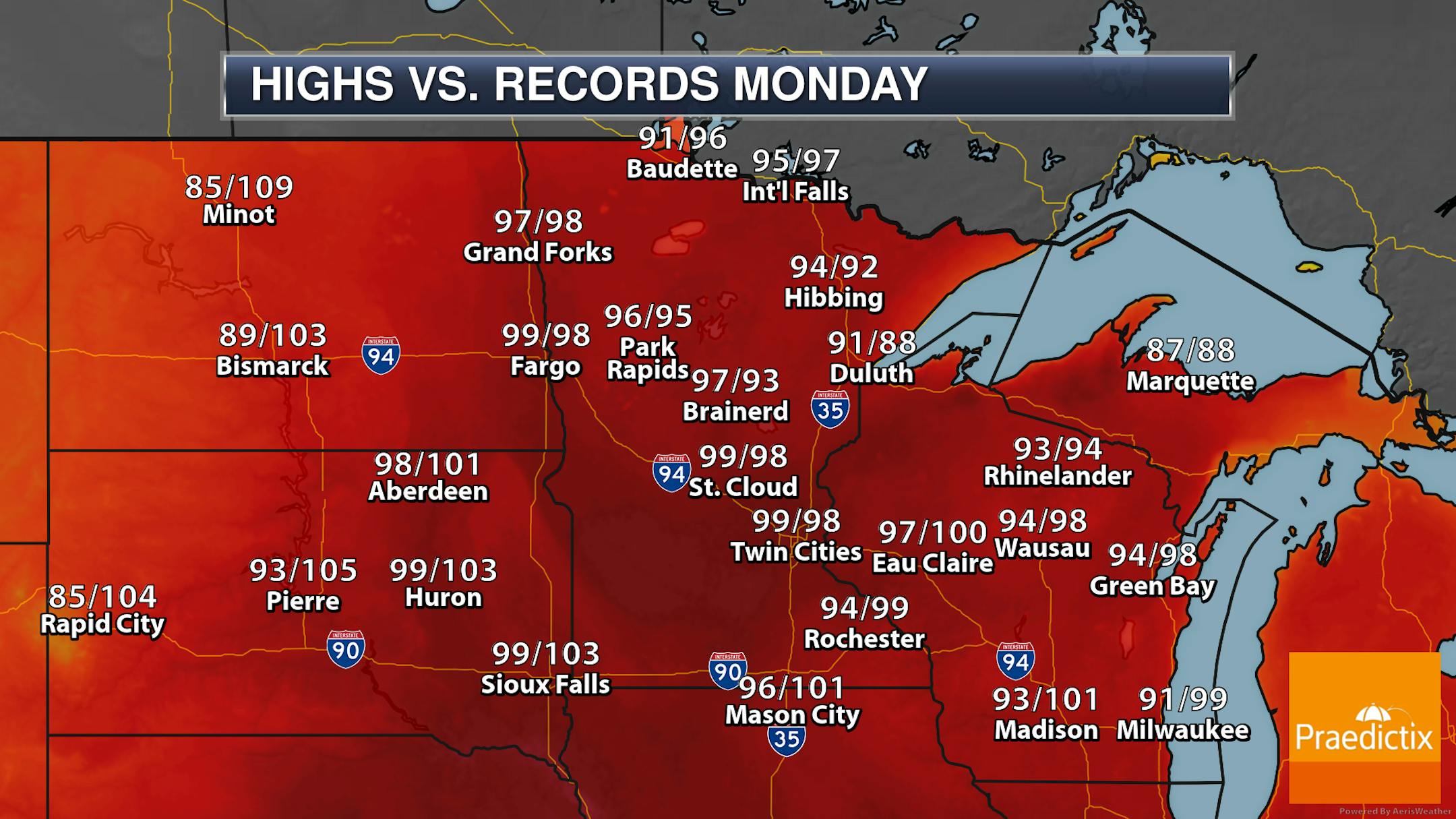 Records look to be broken during this heat wave as well. The highest odds of record-breaking temperatures on Father's Day will be up in the Red River Valley, with record heat spreading east for Monday. Locations that could see records on Monday include here in the Twin Cities, St. Cloud, Brainerd, Duluth, Hibbing, Park Rapids, and Fargo.