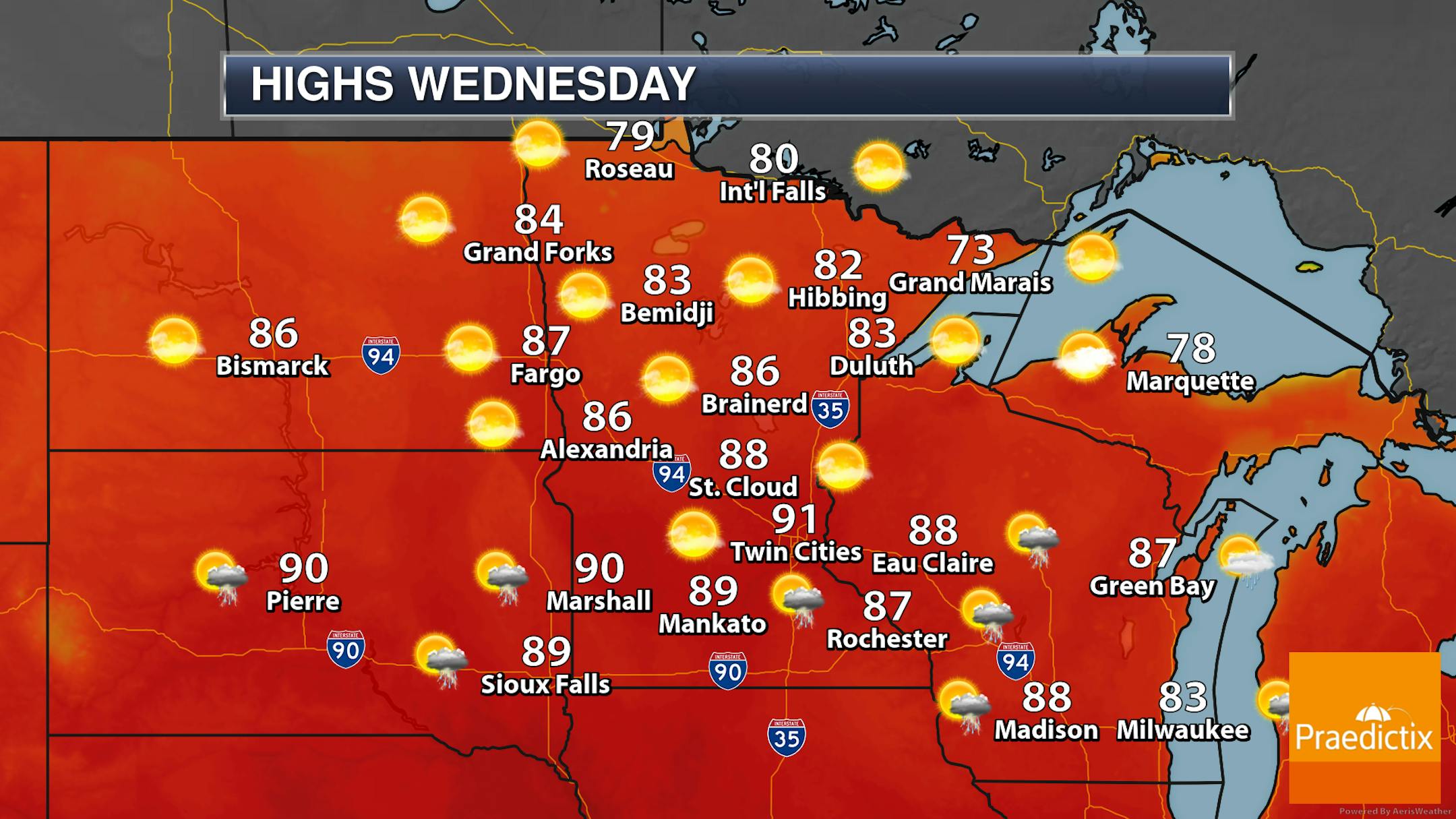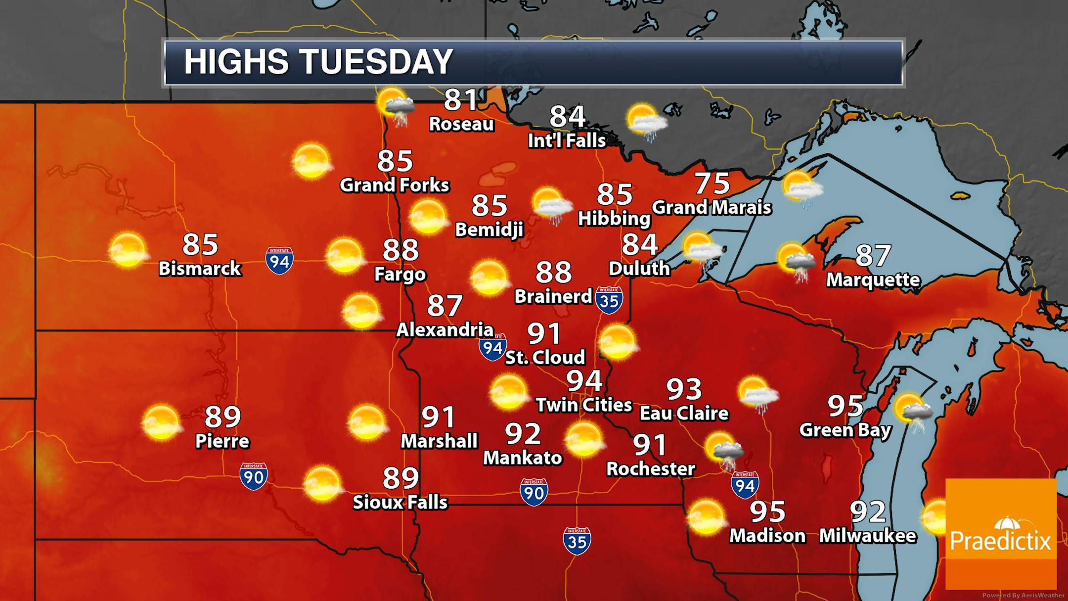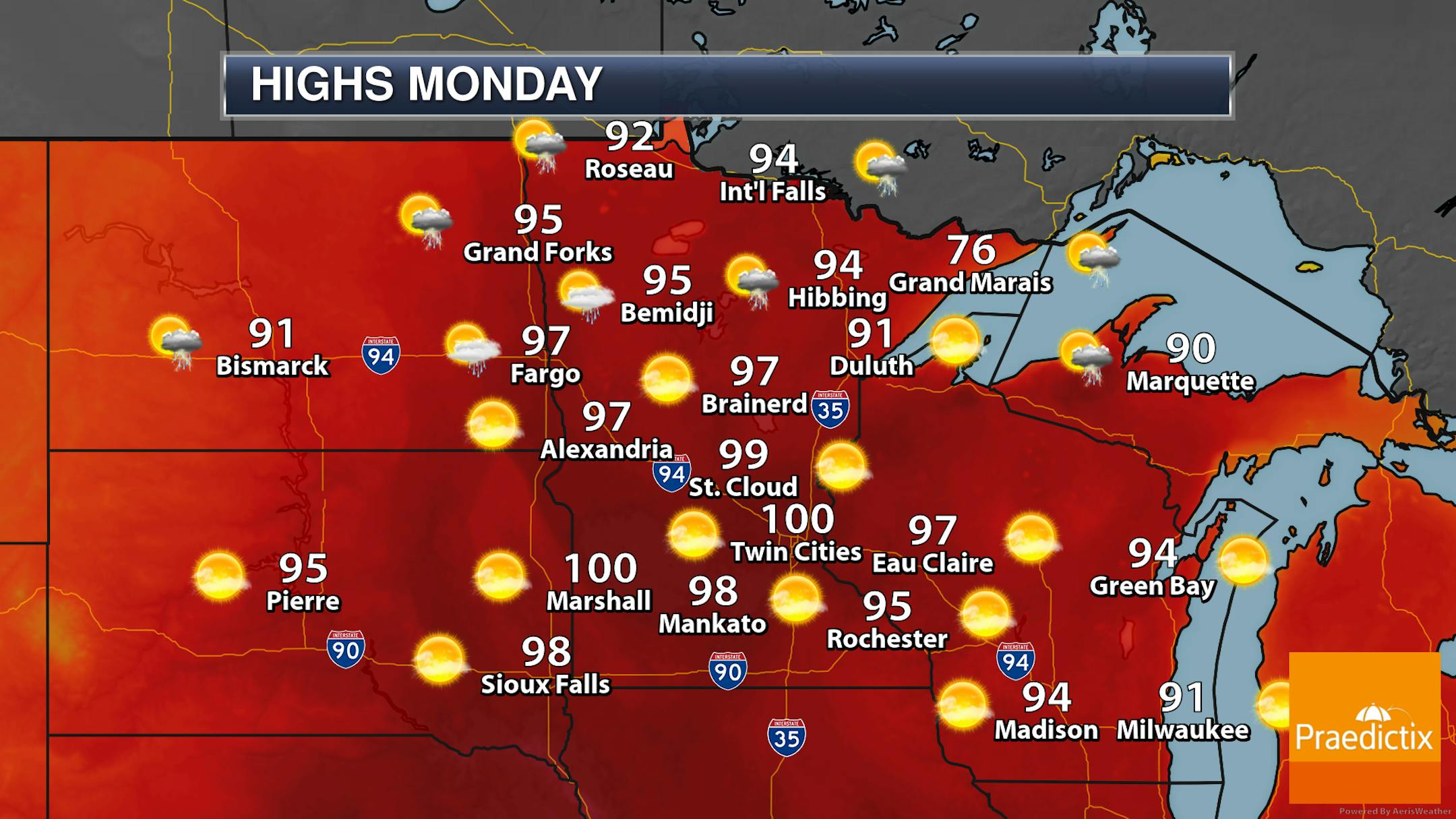 As we head into the Father's Day weekend and early next week we are going to see a northward surge of dangerous heat and humidity into the Upper Midwest. While we remain in the 80s Saturday in the Twin Cities, you can see that bubble of heat already out into the Dakotas and western Minnesota where highs will climb into the 90s and 100s. That will start to work eastward on Sunday, with everyone except the Arrowhead and far southeast Minnesota expected to reach into the 90s for Father's Day (and even a few 100s out in far western Minnesota). Monday will be the hottest day for the metro with record-breaking highs and a shot at 100F. As we head toward Tuesday and Wednesday "cooler" air will start to move in - but at least on Tuesday, we'll still be in the 90s in the metro.