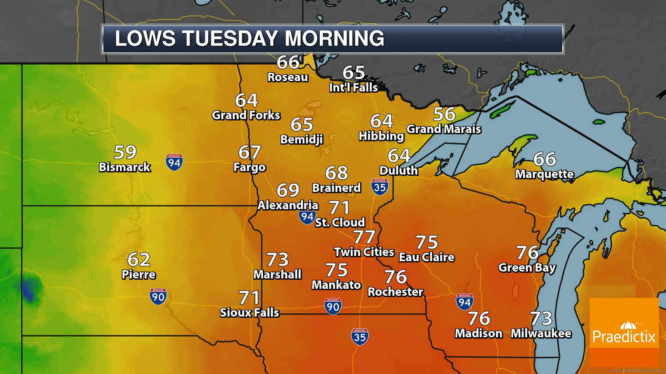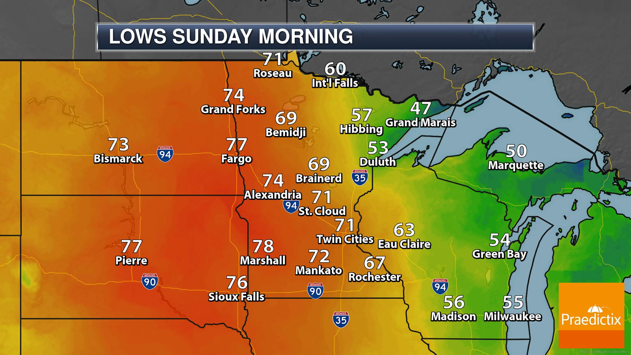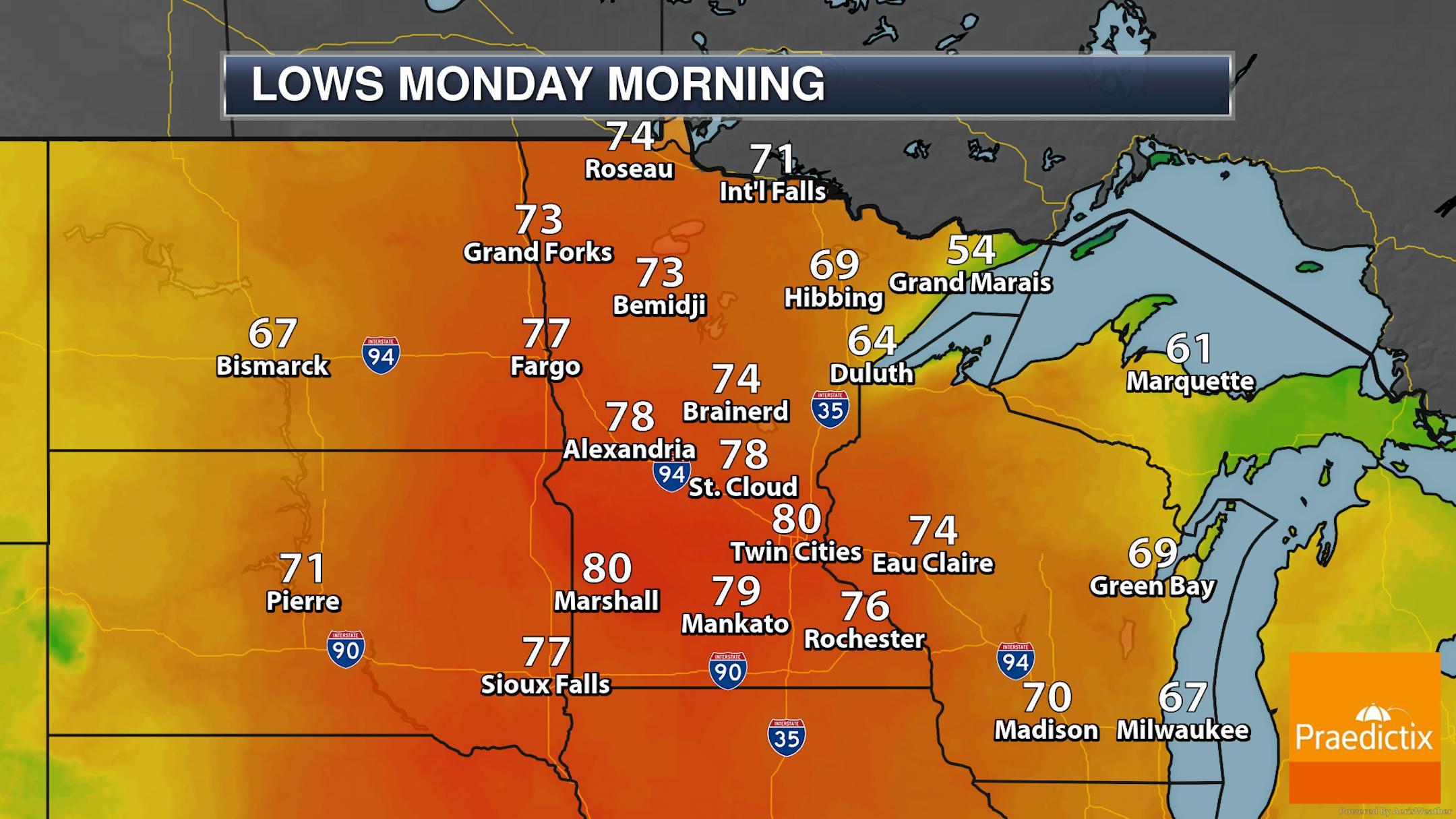 And we won't get much of a break as we head through the overnight hours during this heat wave. Lows are only expected to drop into the 70s Sunday through Tuesday mornings, with temperatures maybe not even making it below 80F Monday morning. In Twin Cities history, there have only been 31 lows at or above 80F, with the warmest low ever recorded being 86F back on July 13, 1936.