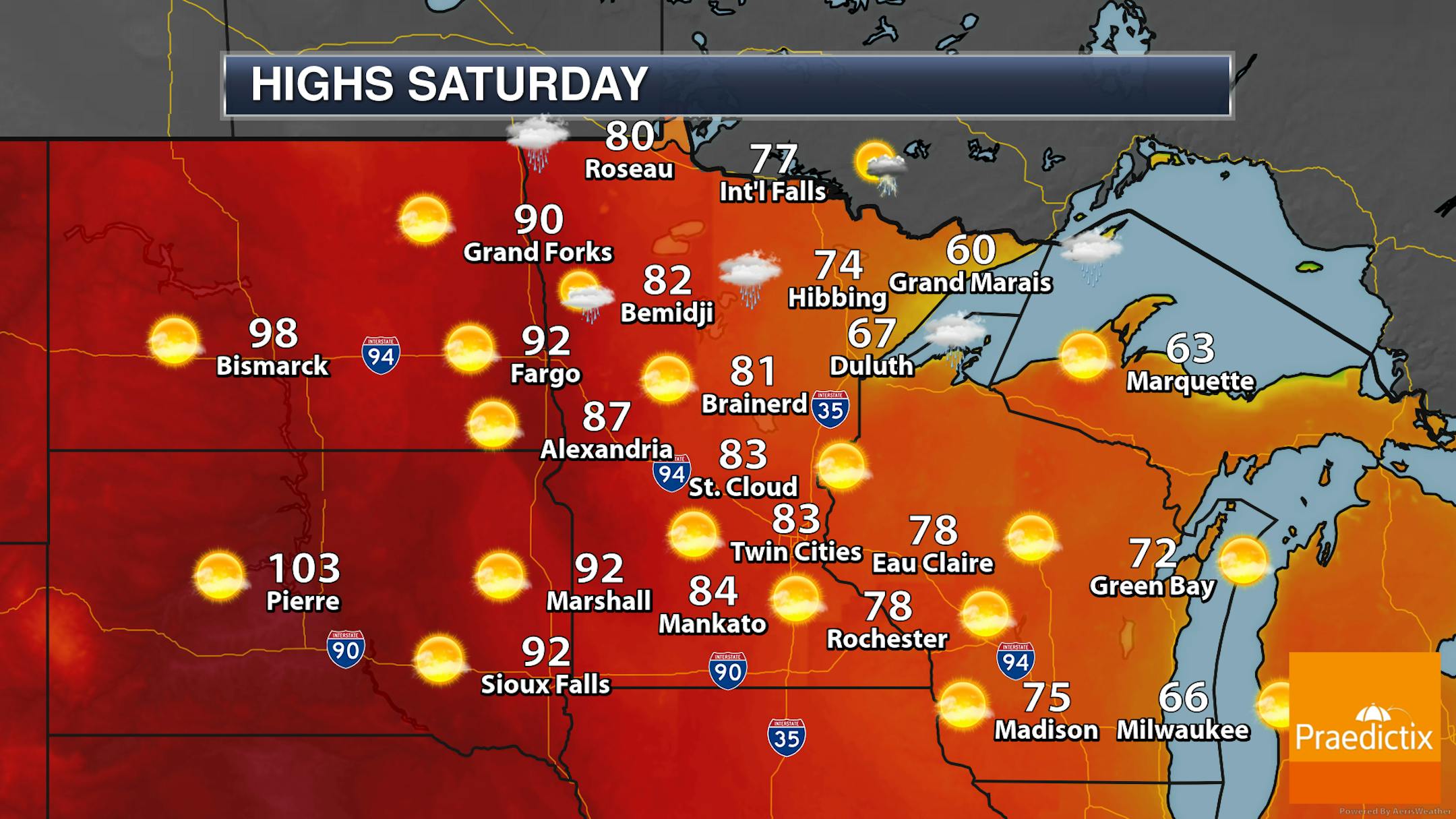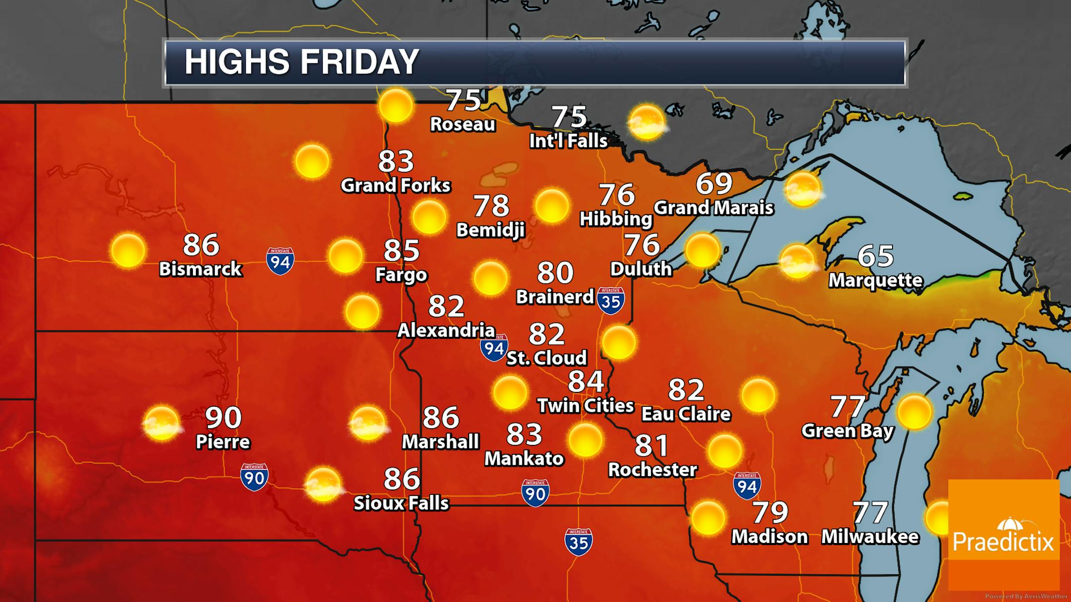 A very pleasant mid-June day is expected Friday across the region, including for the MSHSL baseball games out at Target Field. Morning temperatures start in the 60s with highs in the mid-80s. It won't be quite as windy with northwest winds at 5-10 mph.