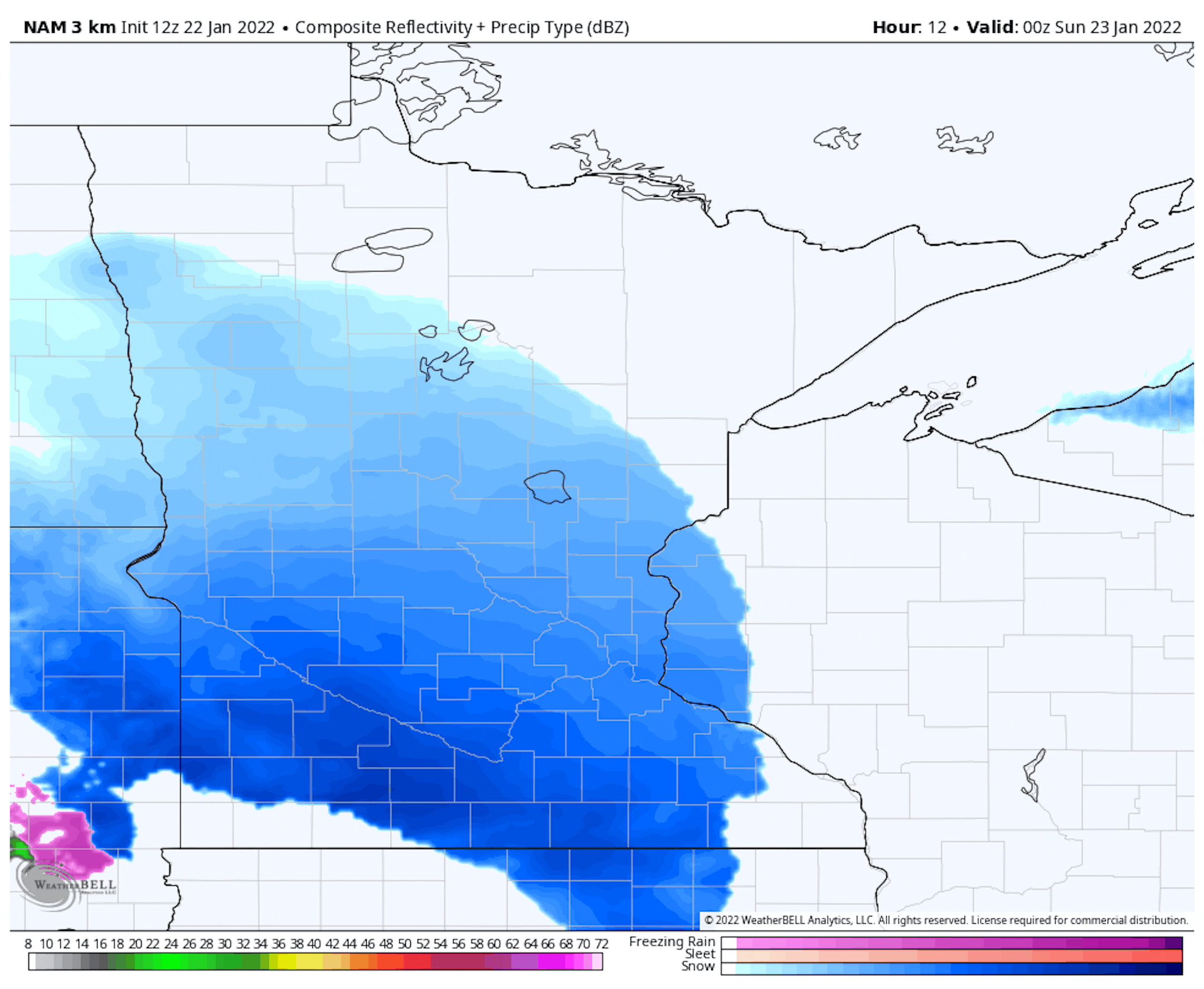 Overall at least an inch of snow is expected in a band between I-94 and the Worthington area, with an enhanced 2-4" band including areas like Redwood Falls and Mankato.