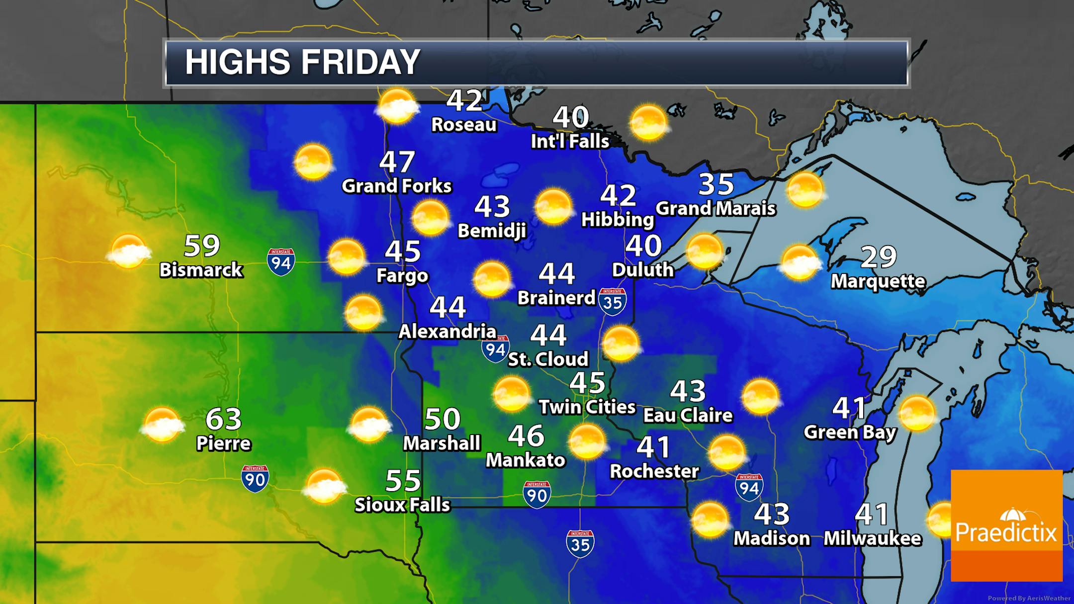 Another above average day is expected Friday statewide, with highs ranging from the 30s along portions of the North Shore to the 50s in southwestern Minnesota.