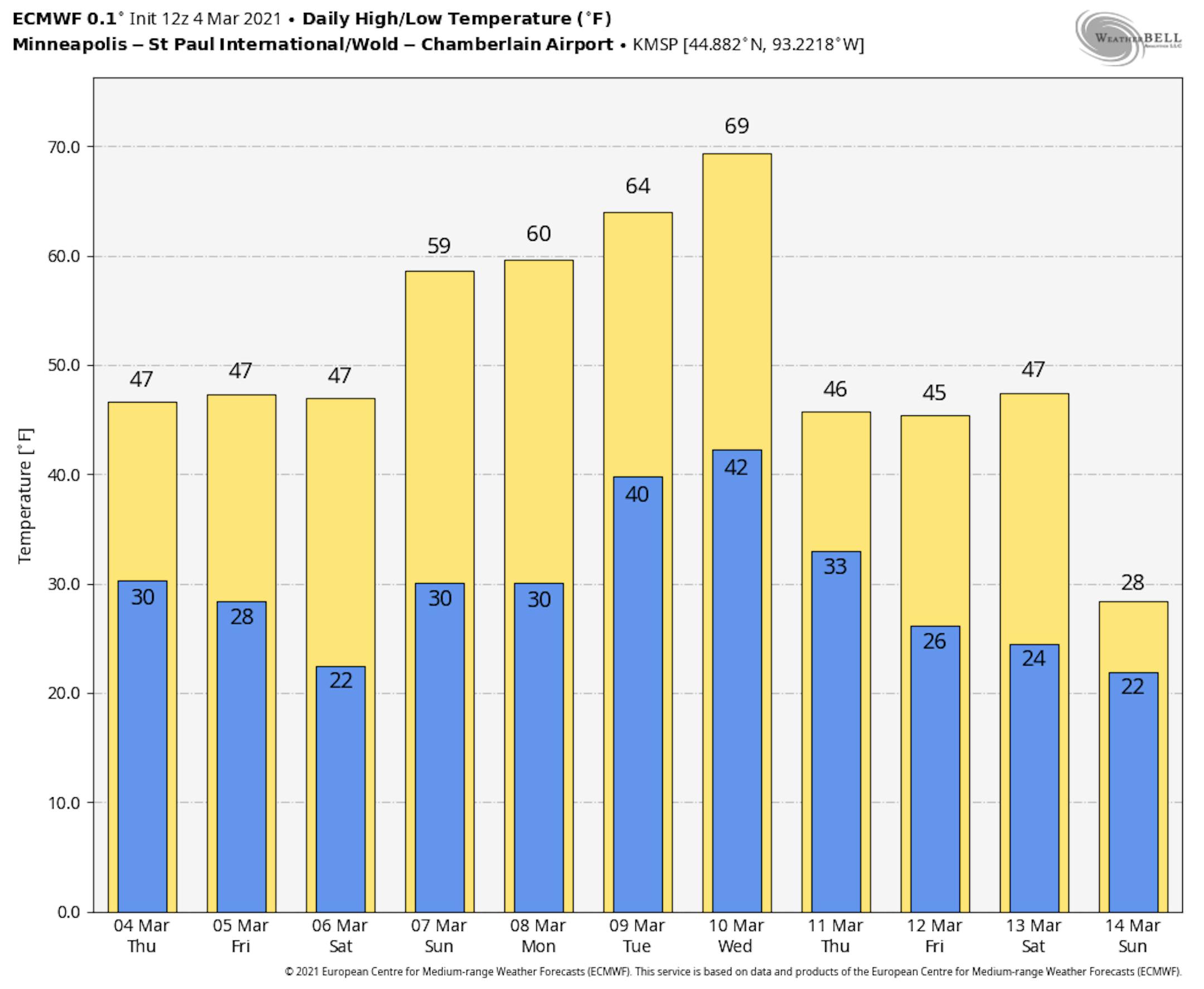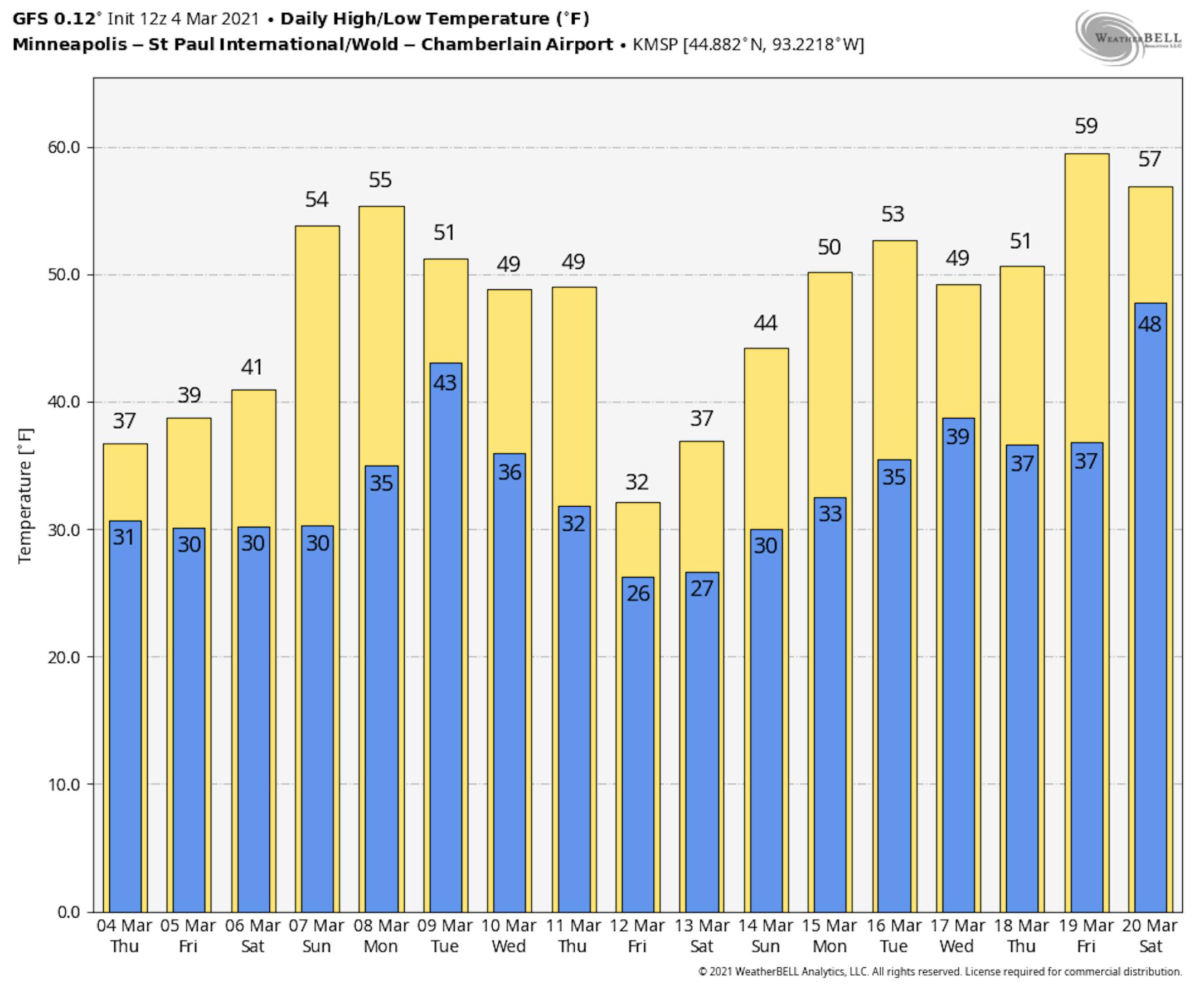 While temperatures will cool a touch heading into early next week, we will still see mid-50s for highs Monday and Tuesday in the Twin Cities as our taste of spring continues.