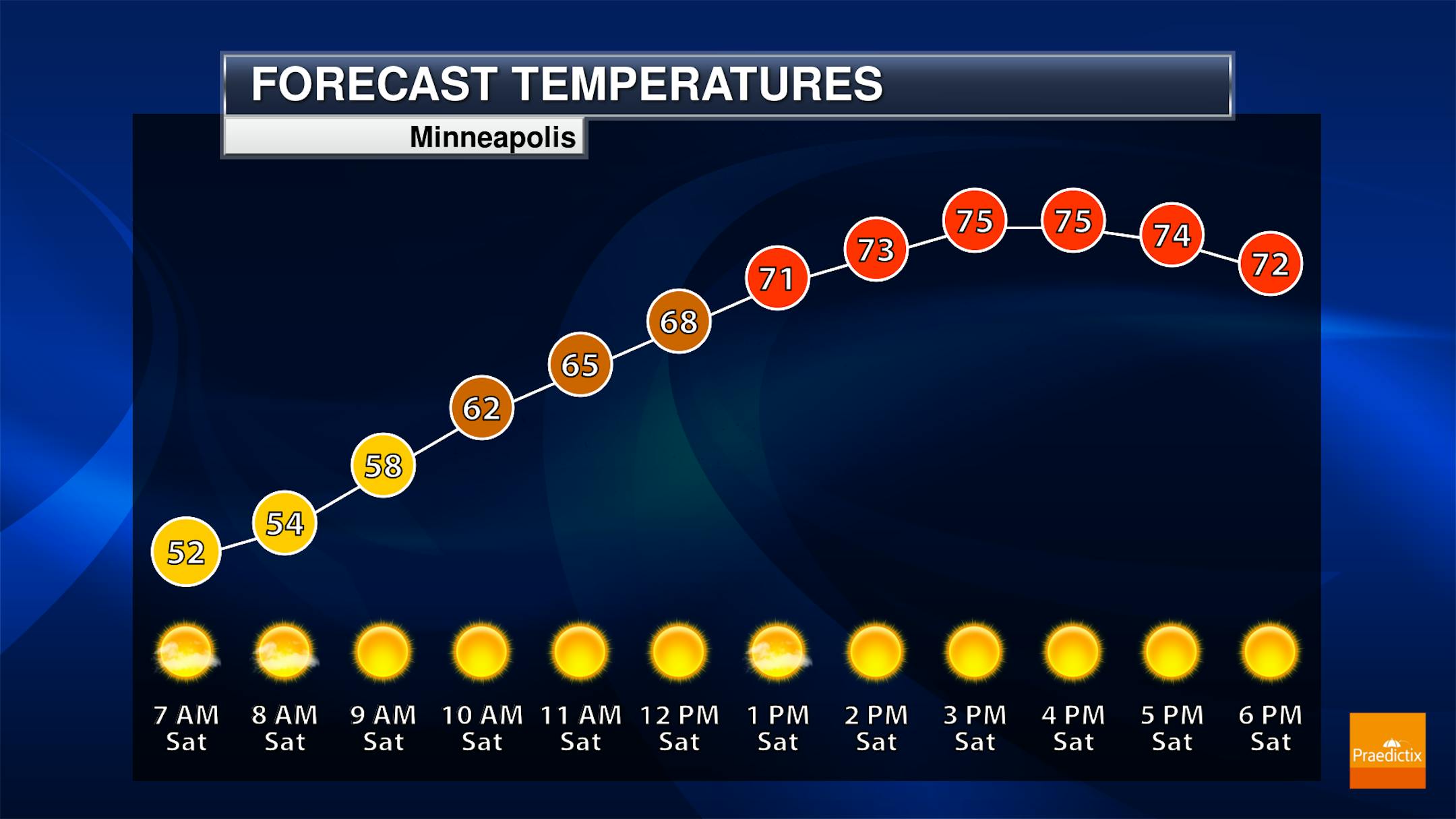 Ready for a pretty well perfect fall Saturday? Too bad the Gophers aren't playing in town! Mainly sunny skies, with just a few passing clouds, are expected to begin the weekend. Morning temperatures will be in the upper 40s to around 50F Saturday morning before climbing to the mid-70s during the afternoon hours. Winds could be a touch breezy at times.