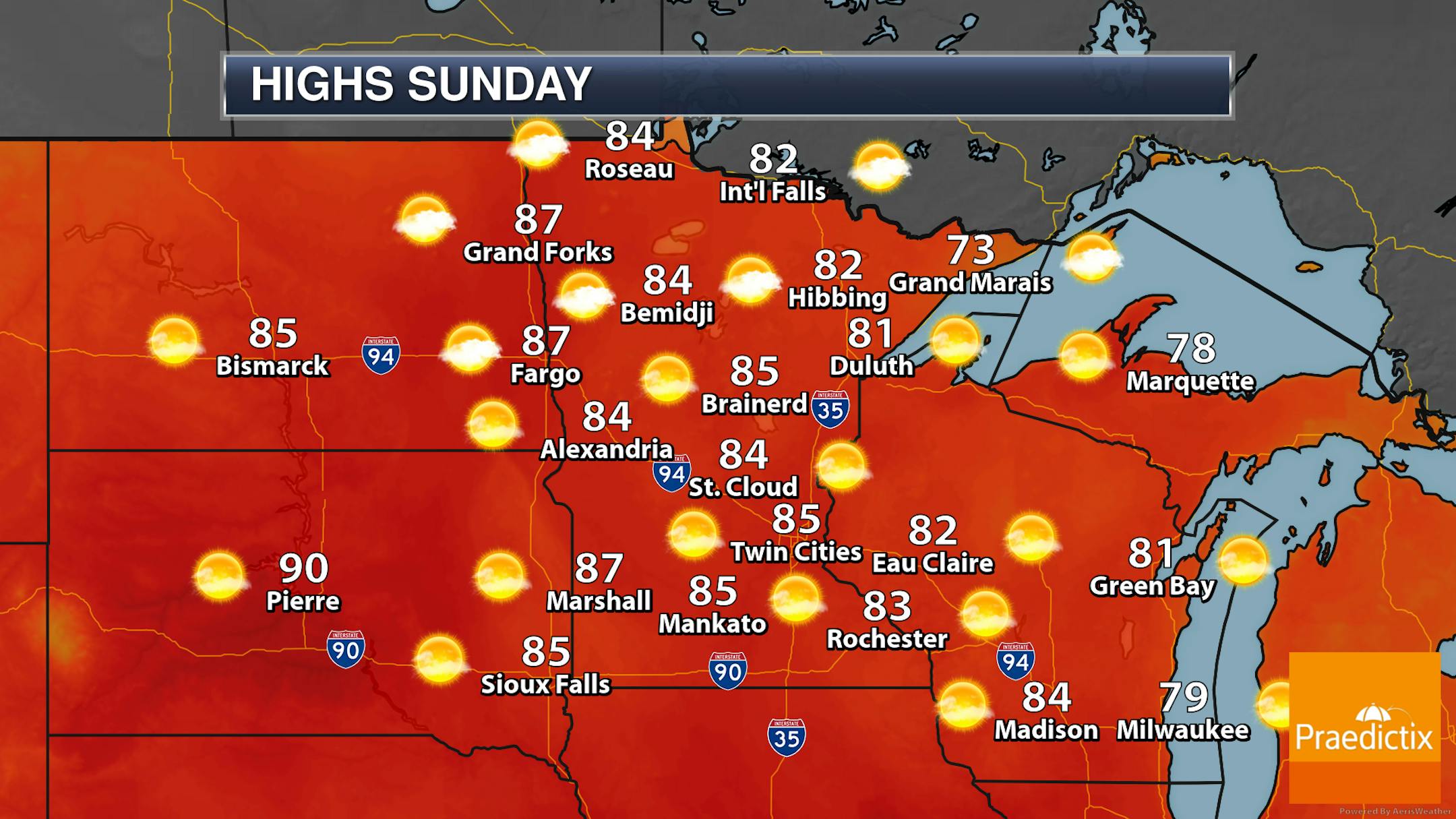 Sunday will be even warmer across the state as a surge of warm air moves in on the back of very gusty southerly winds. Many areas of the state will climb into the 80s for highs, with maybe even a few 90s possible in portions of western and southern Minnesota. Dew points will also be a touch uncomfortable in the 60s.