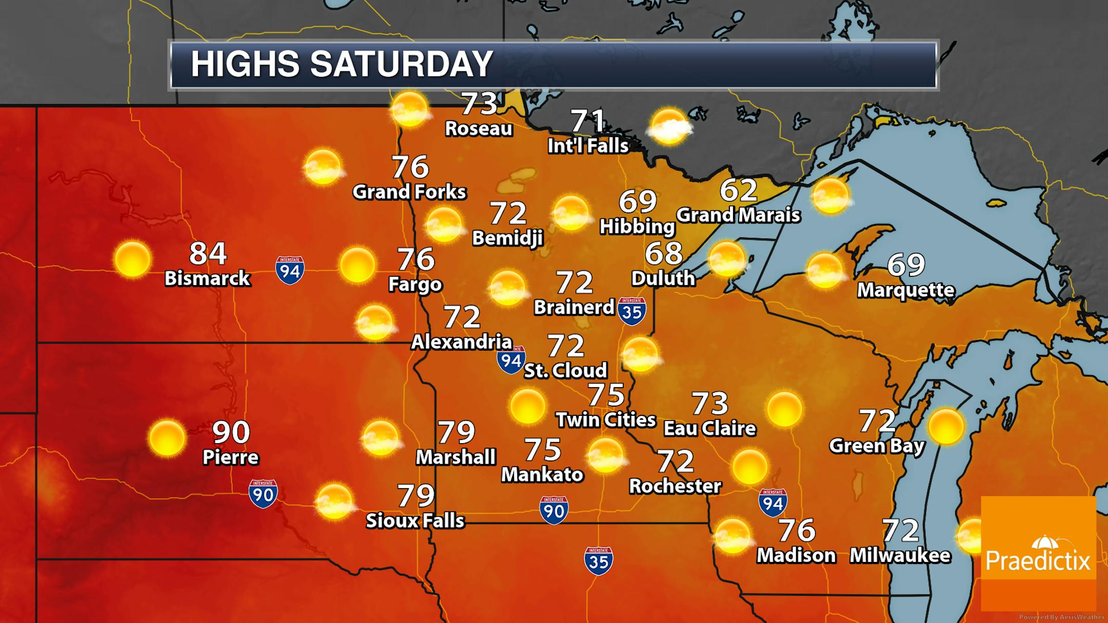 A quiet, mainly sunny day is expected across the state on Saturday with highs ranging from the 60s in the Arrowhead to near 80F out in western portions of the state. A few clouds will move through from time to time, especially in northern Minnesota.