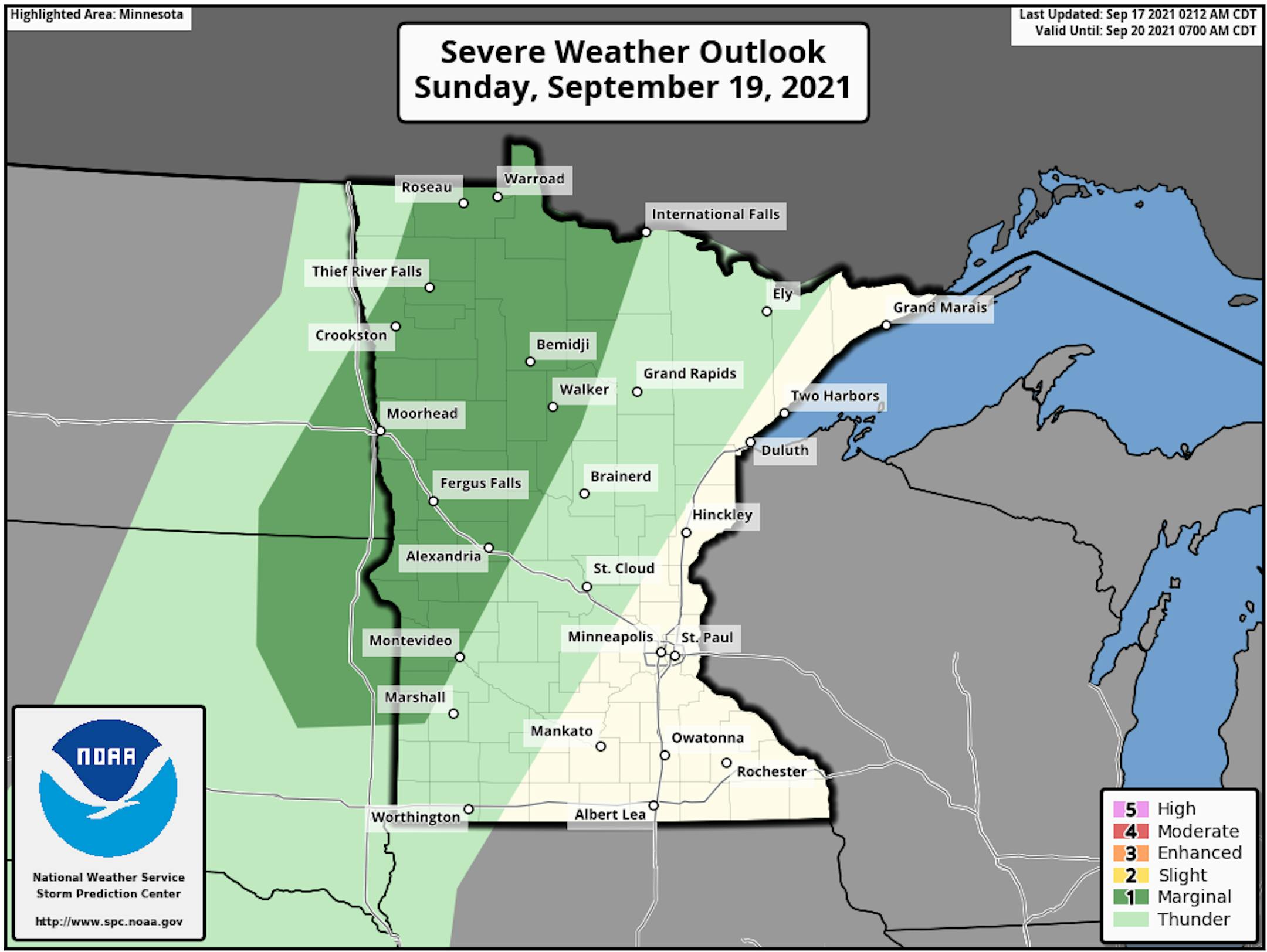 There could be an isolated storm across portions of western Minnesota Sunday into Sunday night that could be on the strong side. The Storm Prediction Center has put a Marginal Risk of severe weather in place.