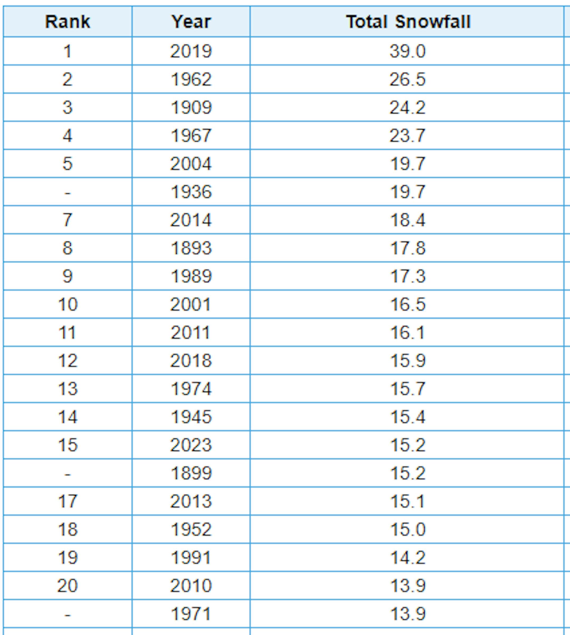 We're now up to the 17th snowiest snow season on record with March (and April) to go. We only need 7.6" to pull into a tie for the 10th snowiest (7.7" for 10th place without a tie) - something that, unless we have a drastic change and fall back to the weather we saw in the first part of February for the rest of the season - seems doable. We'd need 28" to pull into first place.
