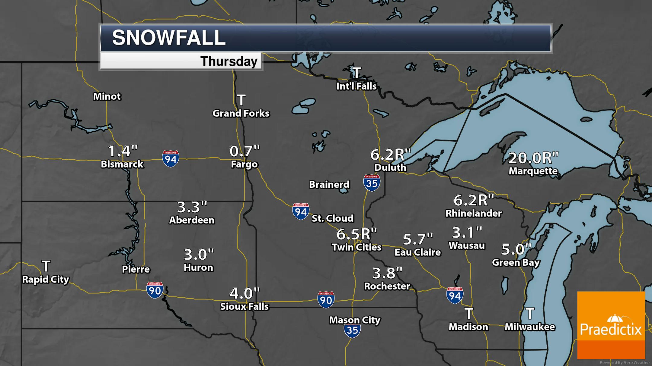 MSP saw a record snowfall on Thursday of 6.5", barely beating the previous record of 6.3" from 1909. We also saw record snow in Duluth, Rhinelander, and Marquette, with the snowstorm pushing out of the region.