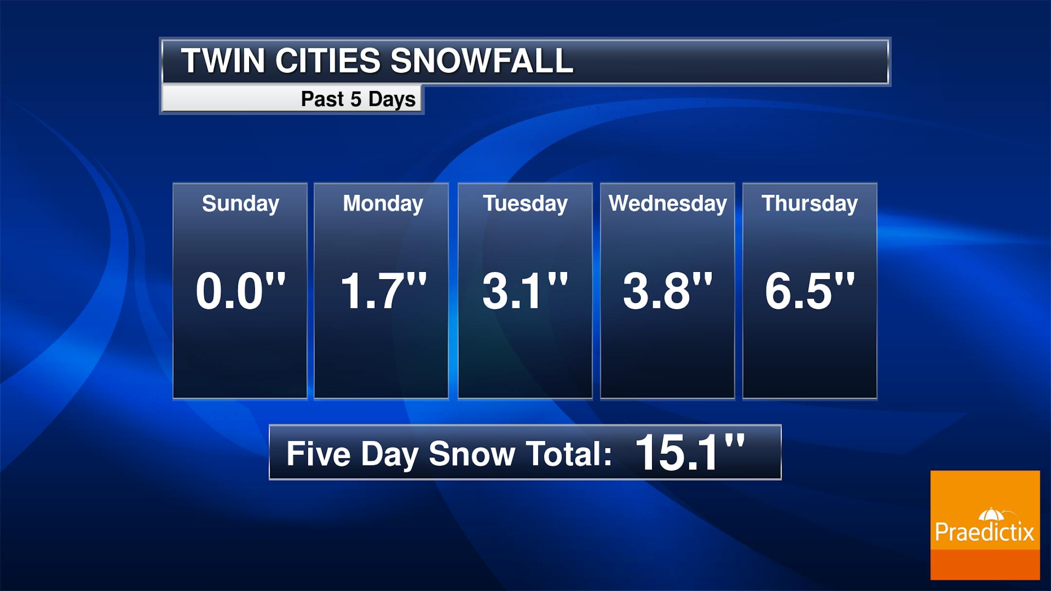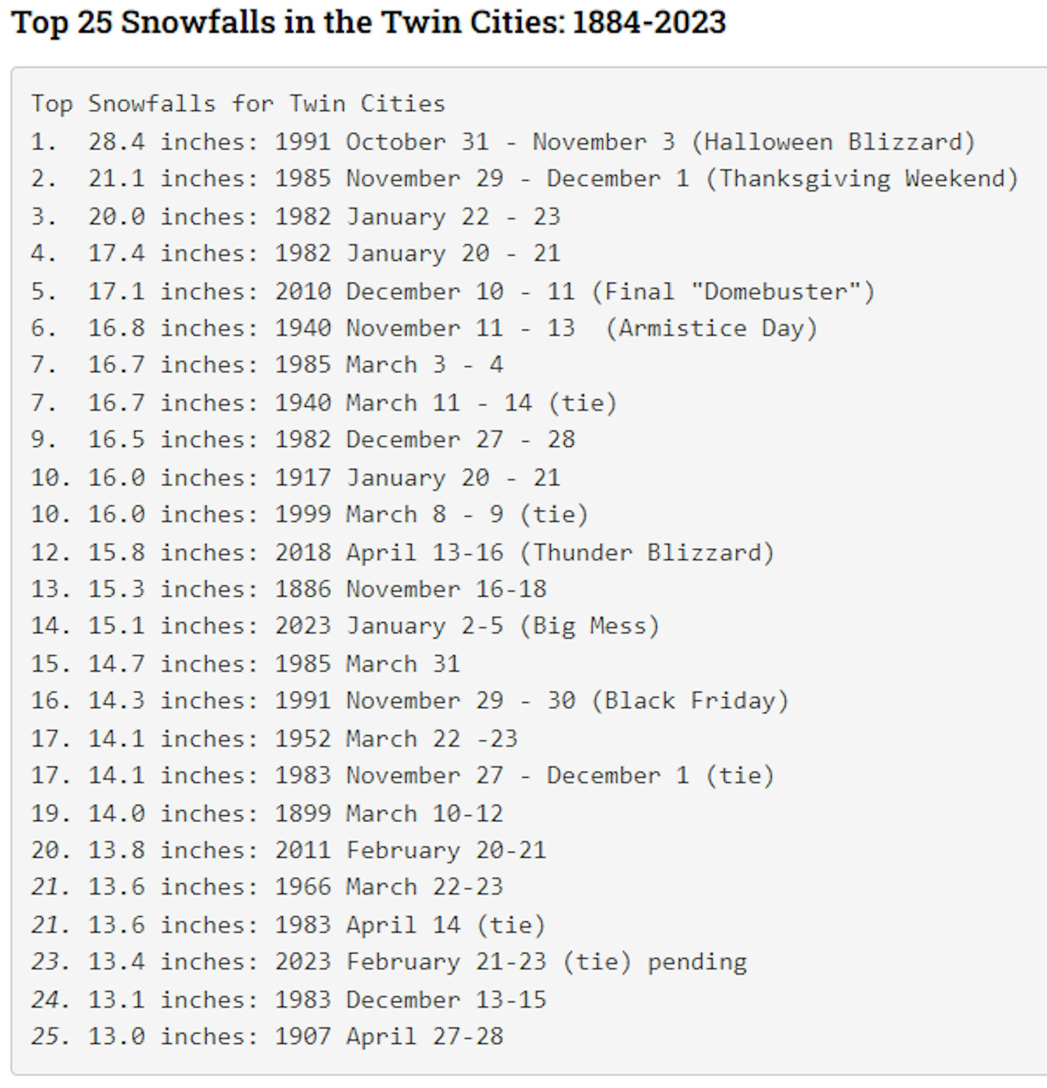 The overall three-day total from this snowstorm was 13.4", ranking as the 23rd largest snowstorm in Twin Cities history according to the Minnesota State Climatology Department. It's also the second snowiest February storm on record, ranking behind the 13.8" that fell on February 20-21, 2011.