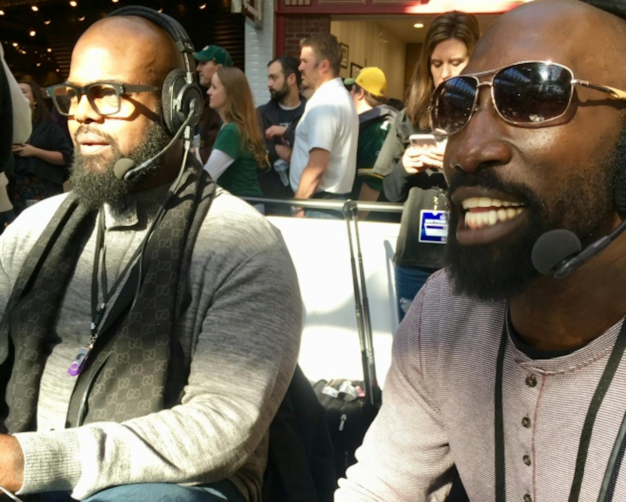 Above: Live from from the Wip Philadelphia radio table at the Mall of America, former Eagles Ike Reese and Tra Thomas banter with hometown listeners about the Super Bowl. A crush of football fans have descended on the Mall of America in search of their football heroes, celebrities and a little bit of Super Bowl hype. A big draw is the hundreds of media outlets from around the world that have set up shop in the north end of the gigantic mall. Fans circle the pop-up network booths and what's known as "Radio Row," where football players — past and present — along with a few celebrities sit down for media interviews. "I wanted to be part of the Super Bowl experience," said Dan Buschow of Minneapolis. At 6-foot-6, he towers over most of the crowd, enabling him to capture photos and videos of the famous and those he thinks might be. "When I see a big guys, I think he's likely a player, especially if he has some beef to him," Buschow said. "I just saw Dan Marino." Nearby, fans shouted out the name of the former Miami Dolphin quarterback in hopes of getting his attention and a photo. Shalondra Dominque of Mississippi maneuvered her phone's camera to catch her own shot of Marino. She's not much of a football fan, but while in the Twin Cities on a business trip, her husband directed her to the Mall of America in search of his football heroes. Her Marino photo will be one more her husband will add to his "man cave." A moment later, fans whooped and clapped. Dominque aimed her camera and got another photo.She had no idea who she was looking at. But he must someone, she said. "I'll have to ask my husband." For the broadcasters on the other side of the ropes inside of "Radio Row," the extravaganza is just as exciting. "I'm crazy about sports so sports broadcasting is my toy store," said Bob Gelb with WFAN in New York. A few tables down, Philadelphia sports talk show host Jon Marks and former Eagles Ike Reese and Tra Thomas bantered back and forth for fans back home. "You get to Thursday and you're ready to play the game," Reese said into his microphone on his headset. "The pre-game obligations with radio, television and print interviews is exhausting. You answer the same question over and over," he said. "Practices and team meetings are a safe haven from having to answer questions."But this is what the players and fans aspire to all year, said Marks during a break in his show. I'll certainly remember this for the rest of my life."