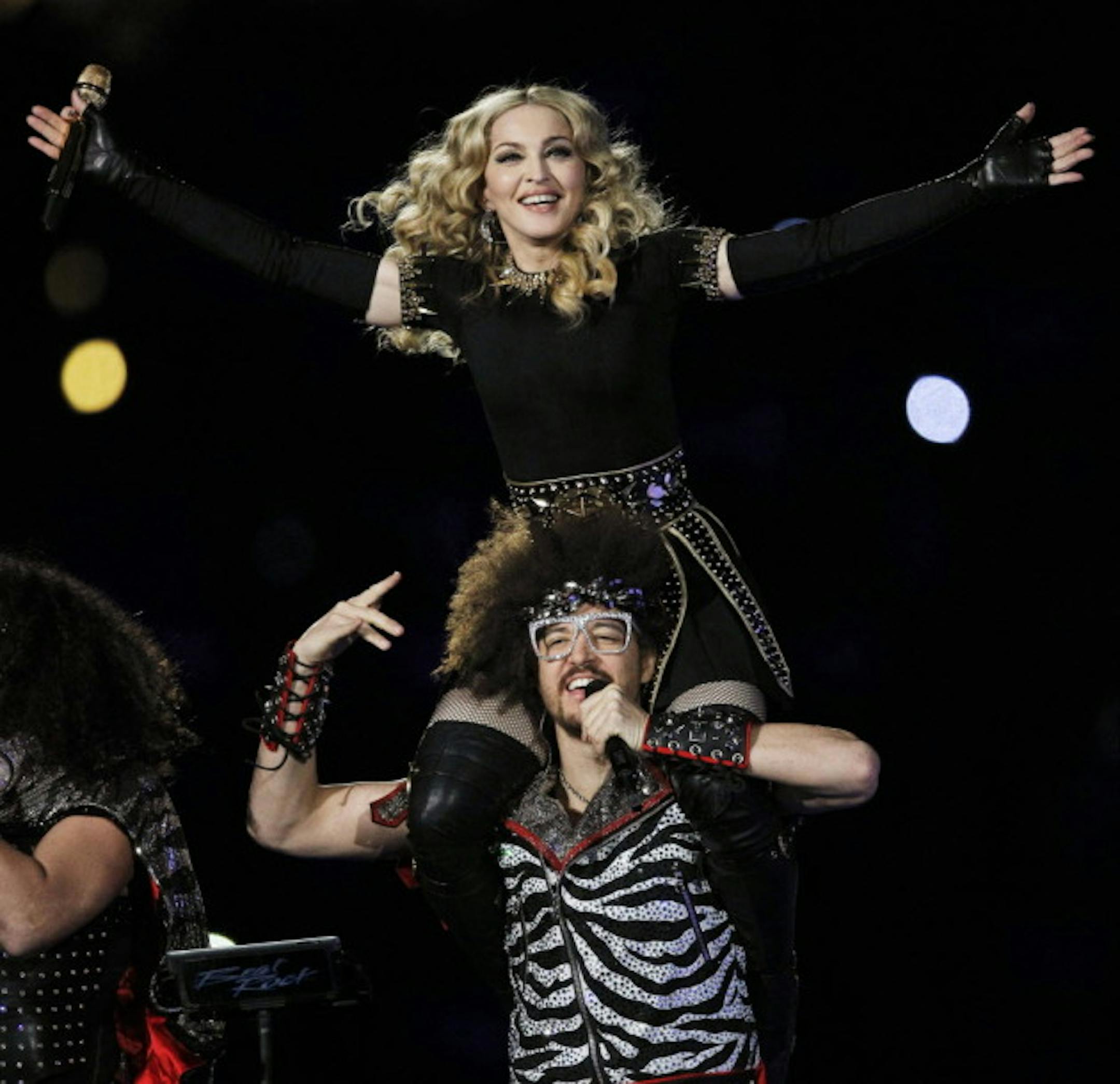 Madonna gets a Super Bowl ride from Redfoo of LMFAO / Associated Press photo by Paul Sancya