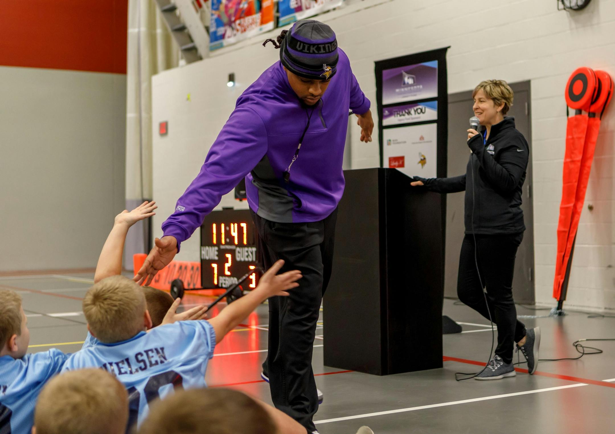 Former Vikings linebacker E.J. Henderson arrived in town Tuesday to run students through a few practice drills and to distribute $60,000 in grants to youth recreation and nutrition programs. It's part of "52 Weeks of Giving" by Minnesota's Super Bowl Host Committee, which is crisscrossing the state all year, distributing grants leading up to America's 52nd Super Bowl next February in Minneapolis.