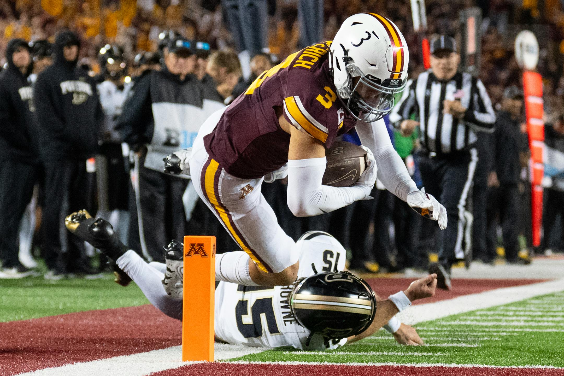With the Gophers already down 7-0 on backup quarterback Malachi Singleton’s 40-yard touchdown run on the game’s first possession, the Boilermakers threatened to go up by two TDs. On the first play of the second quarter, Purdue’s Devin Mockobee attempted a halfback option pass to Corey Smith in the end zone. In swooped Brown, whose diving interception brought back memories of Antoine Winfield Jr. vs. Fresno State in 2019.