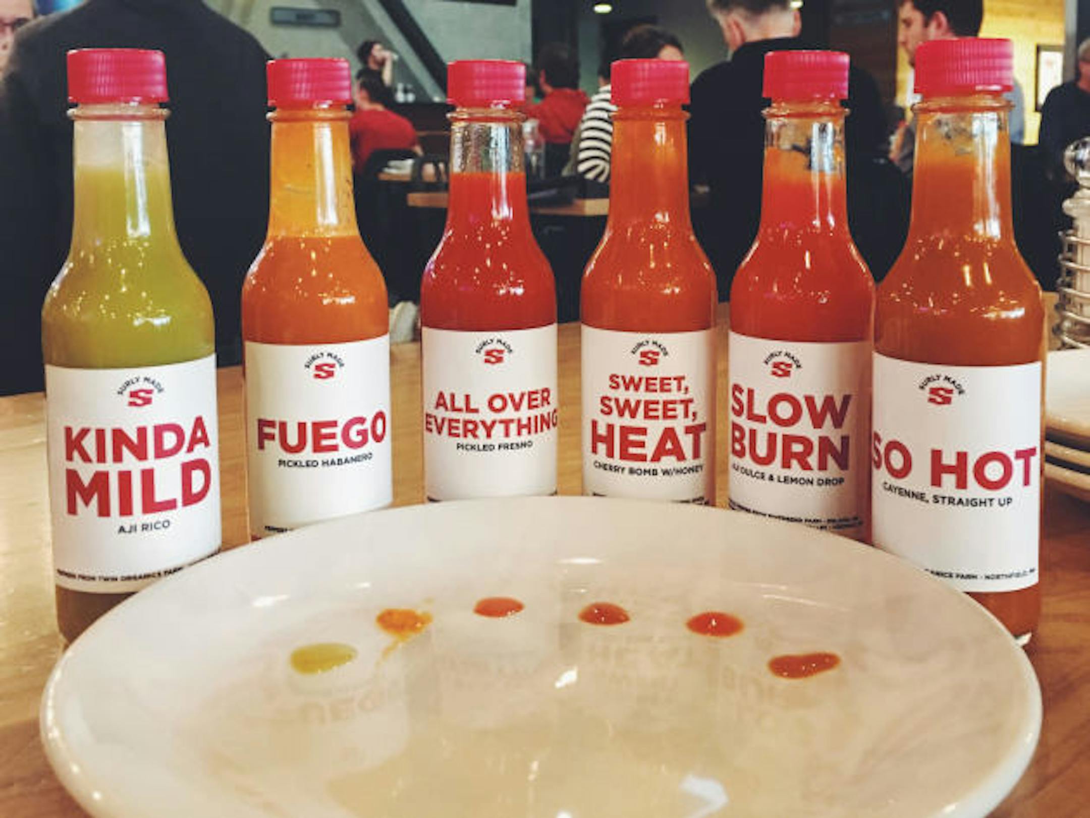 Also new to the beer hall: a made-in-house hot sauce line, with six flavors ranging from "kinda mild," made with aji rico peppers, to "fuego," made with pickled habaneros.