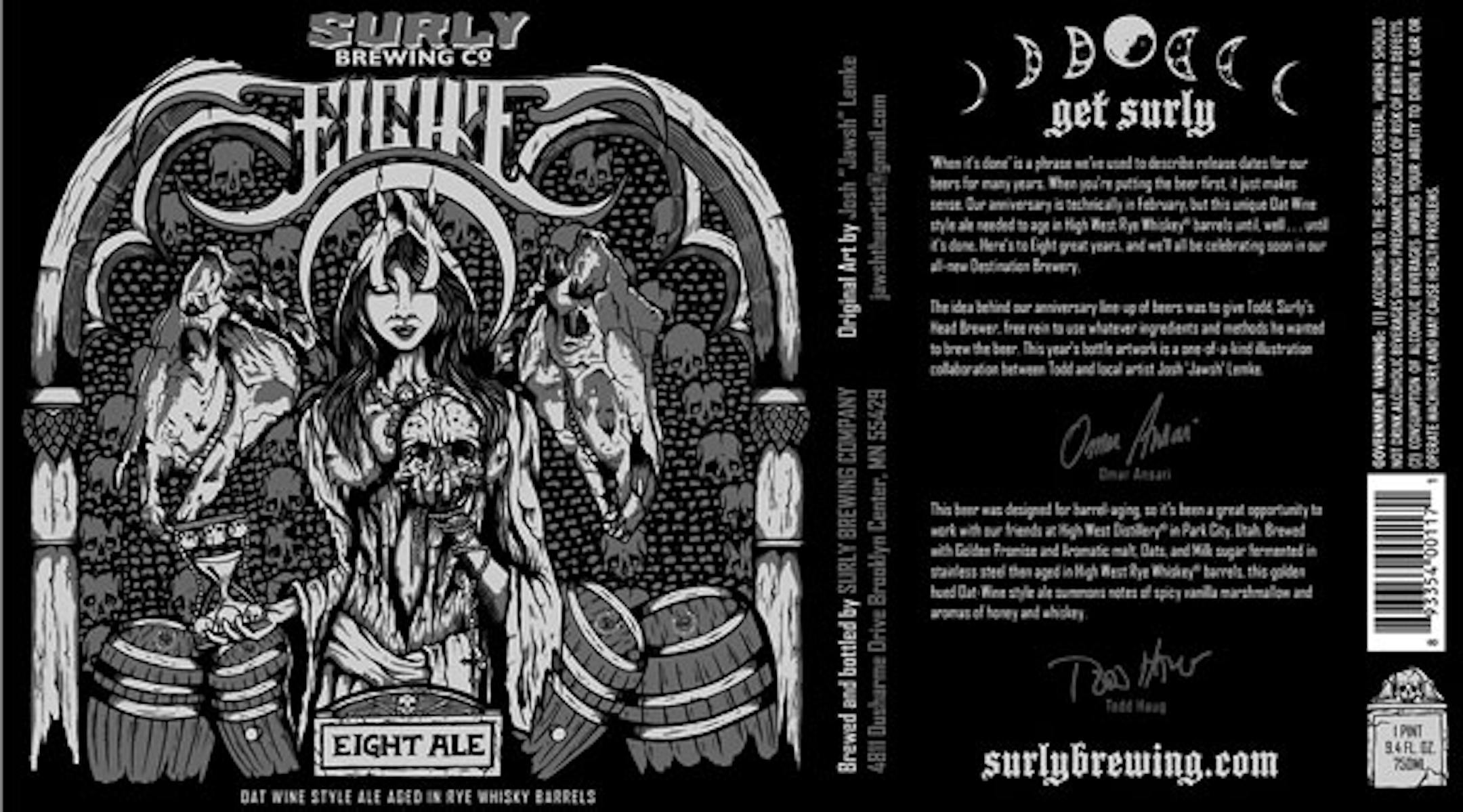 This year Surly's potion is an Oat Wine Ale aged in High West Rye Whiskey barrels and utilizes milk sugars, Golden Promise malt and of course oats. The beer is dressed with a haunting label that depicts a woman holding a skull in a room surrounded by whiskey barrels. The artwork was created by Jawsh Lemke in collaboration with brewer Todd Haug.