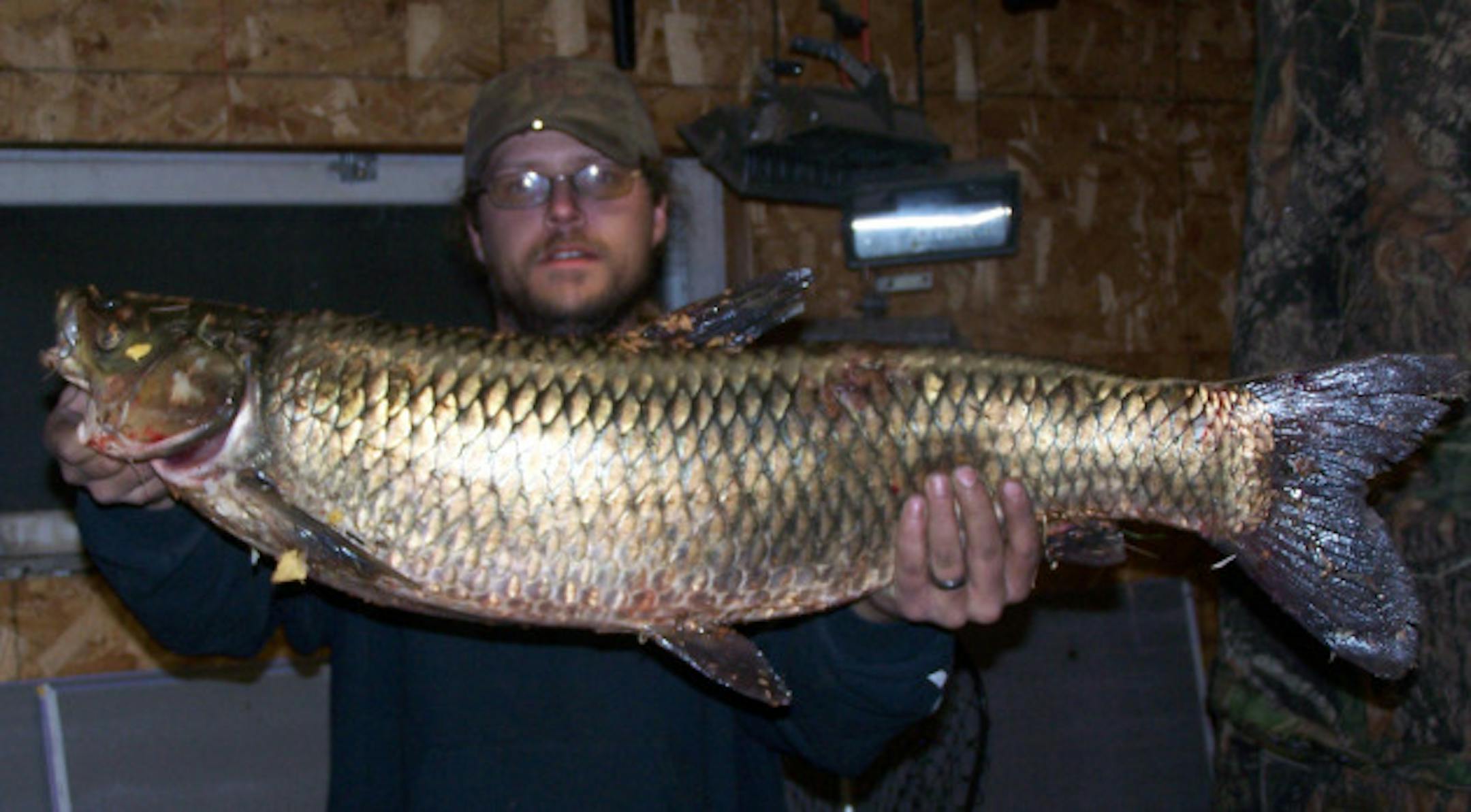 Zach Eastlick of Hatfield, Wis., was carp fishing with a bow and arrow Saturday on the Mississippi River near Trempealeau, Wis., -- south of Winona -- when he arrowed this 21-pound grass carp."They knew they had something unusual because they fight like crazy,'' said Fred Christen of Osseo, Wis., who sponsored the boat Eastlick was using. "That's a good-sized fish.''Grass carp, an invasive species, occasionally have been found in the Mississippi for more than a dozen years, usually in the nets of commercial fishermen. One was caught in the St. Croix River in 2006."We haven't seen the population explosions (as other invasive carp have exhibited),'' said Tim Schlagenhaft, DNR Mississippi River coordinator. "They are vegetation eaters.''Grass carp, which can grow up to 70 pounds, are native to southeastern Russia and northwestern China and were brought to the southern U.S. in the 1960s to control aquatic plants in reservoirs and aquaculture farms.