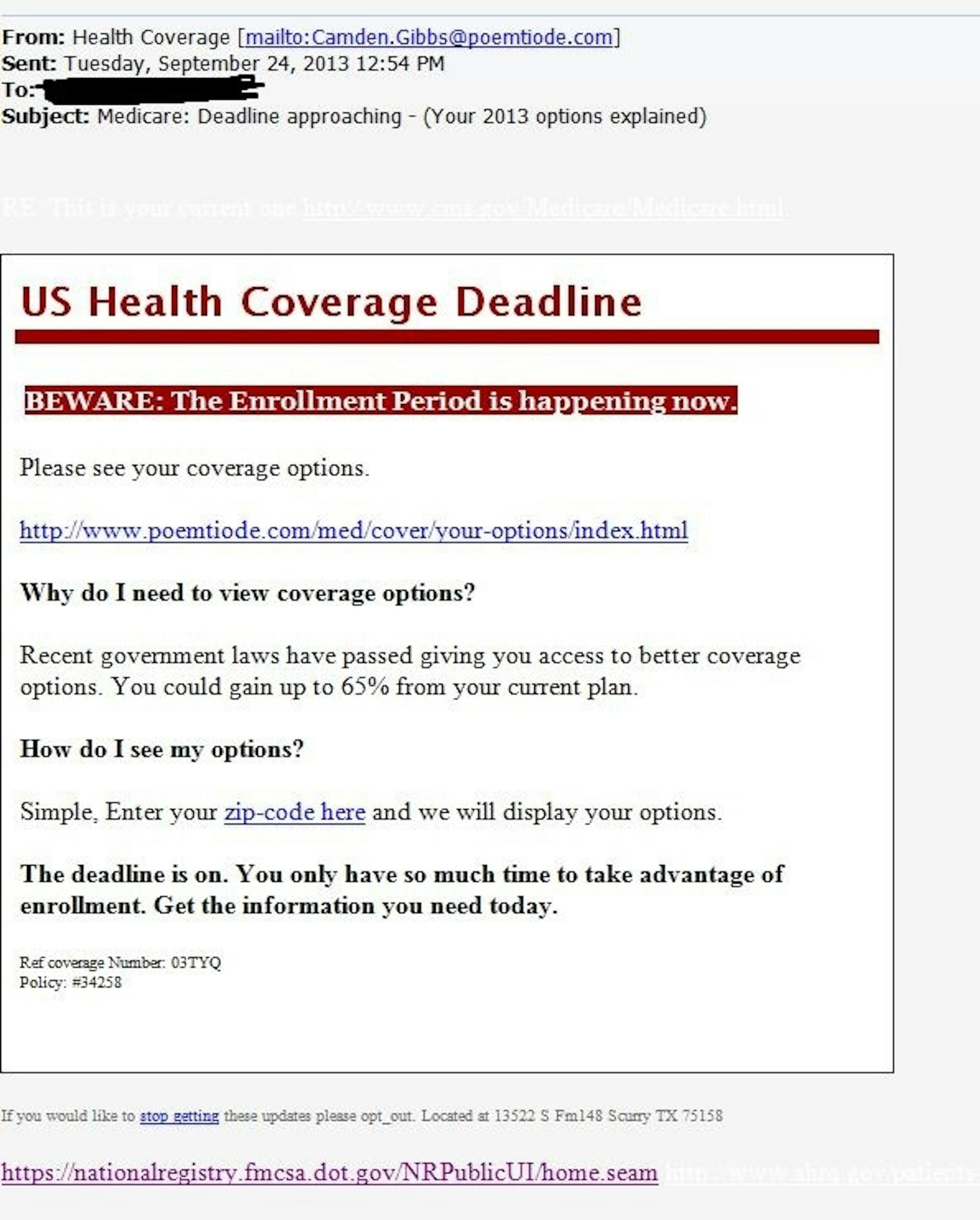 Neither of the employees clicked the link, but we suspect it is either malware or a link to a bogus health care site. Notice that the two e-mails have different links for the coverage options.