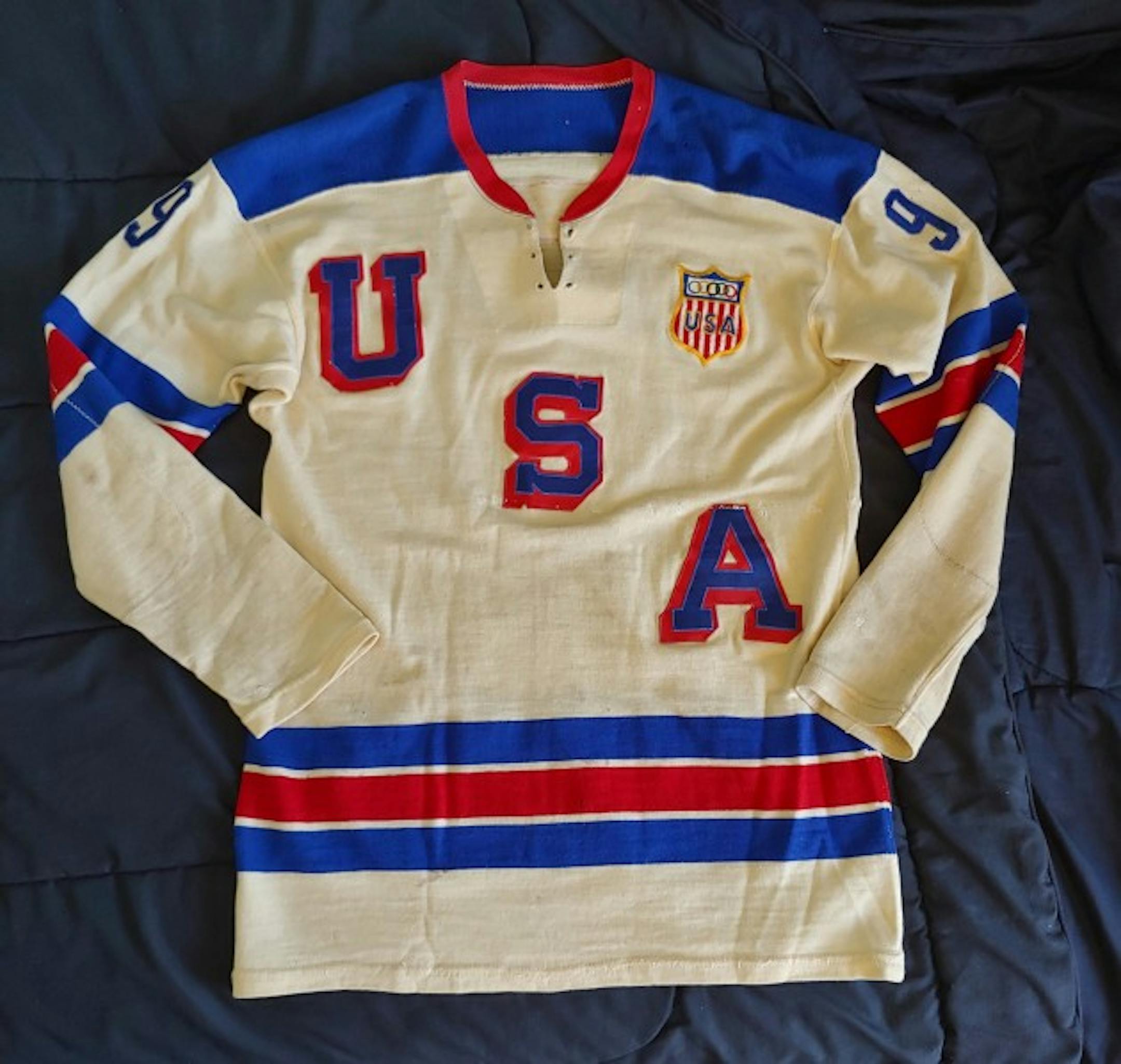 The matchups we have are a Minnesota Warriors sweater submitted by Michael Ullmer and Roger Fredsall against a Minneapolis West High School jersey submitted by Joe Rockhead. In the other semifinal, a 1960 U.S. Olympic jersey worn by gold medalist Rod Paavola and submitted by his son, Boyd, squares off against a beer league championship team named the Mastodons submitted by Tom Mclaughlin.