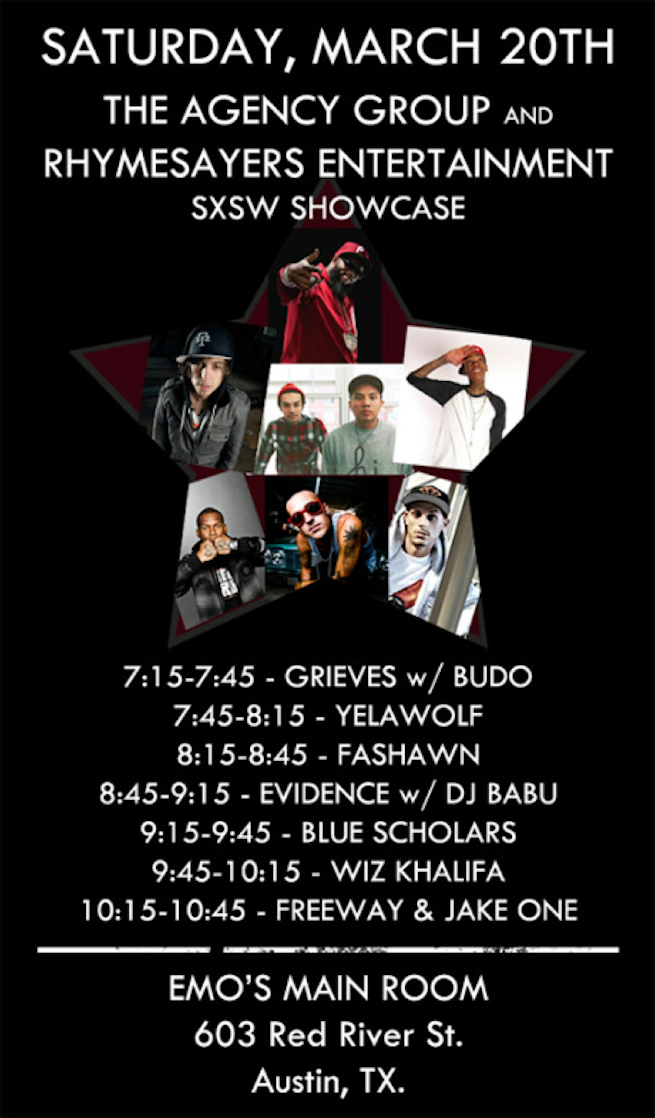 Last year's parking-lot-bulging Rhymesayers showcase at the Southwest by Southwest Music Conference hinted at the busy year to come at the Minneapolis hip-hop label, as local stars P.O.S., Brother Ali, Eyedea & Abilities, Toki Wright and BK-One all performed to tout their respective 2009 releases. This year's Rhymesayers SXSW showcase hints at another bustling year, but it's a lot less Minnesotan: The lineup at Emo's on Saturday, March 20, will include Freeway with Jake One, Evidence (of Dilated Peoples fame) and Grieves, all acts who've come to the label from out of state. In fact, the only local performer on the bill is DJ/producer Budo, who's backing Grieves. Rhymesayers is co-hosting its showcase with the Agency Group (booking agency behind a lot of its tours), so some non-RSE acts are in the show too, including the hotly buzzing Wiz Khalifa.