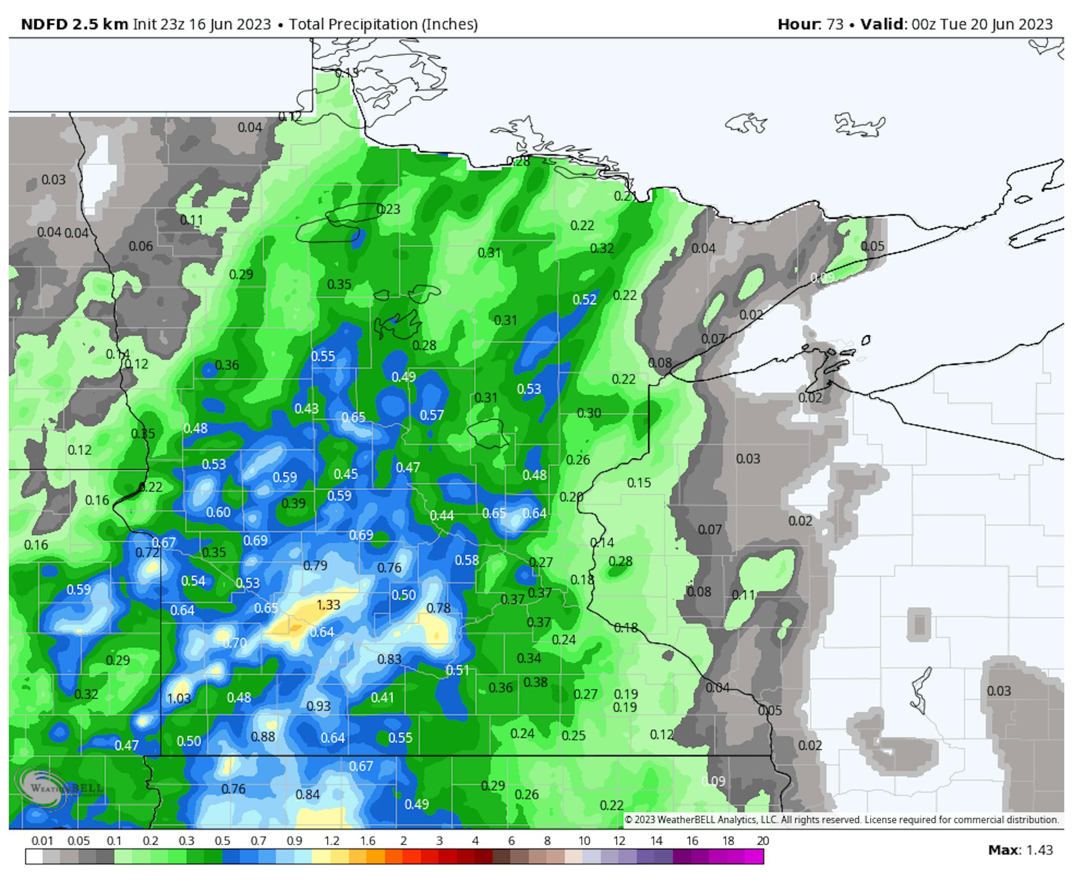 The extended rainfall outlook through the weekend shows pockets of decent rainfall here and there west of the Twin Cities Metro. Some locations could see up to an inch or more, but again, it'll be pretty isolated.
