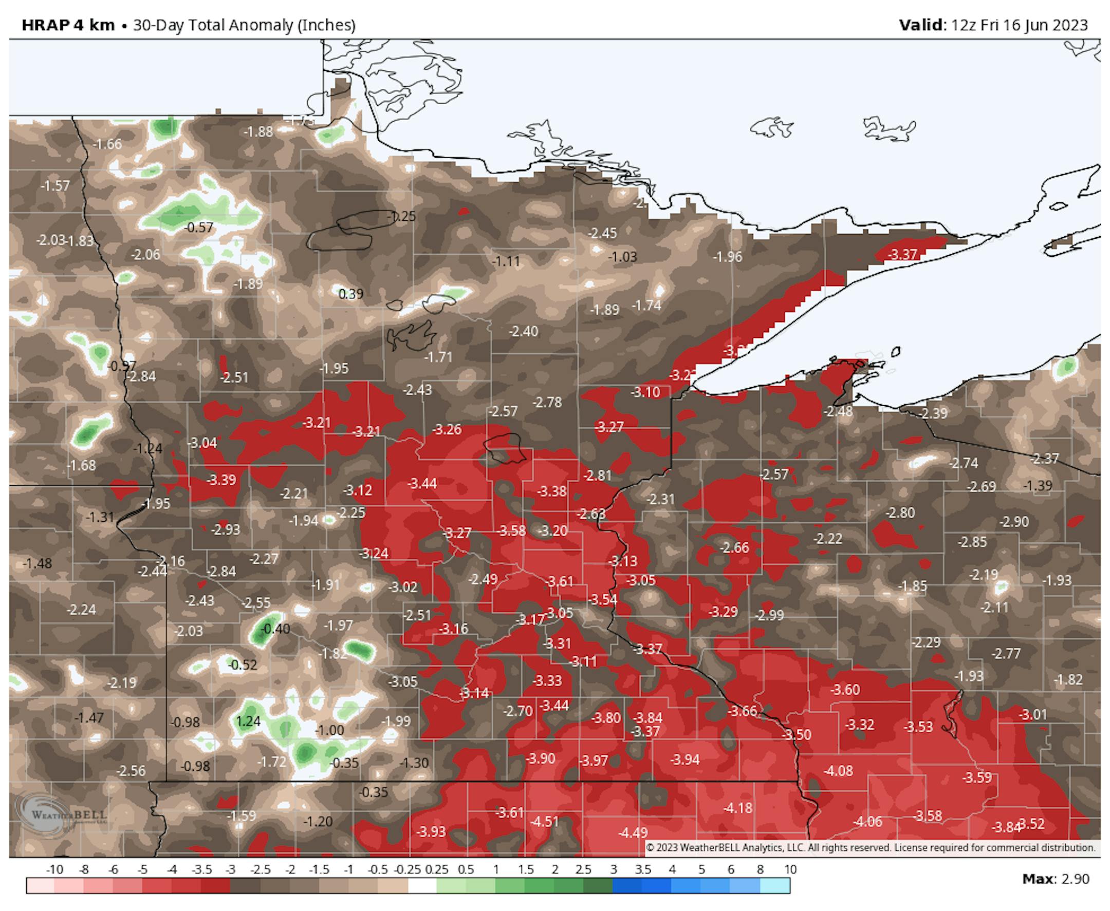 The map below shows the 30 day precipitation anomaly, which indicates that some locations in red are nearly -3.00" or more below average since mid May. This is where drought conditions are expanding... We could use some rain and buckets-loads at that!