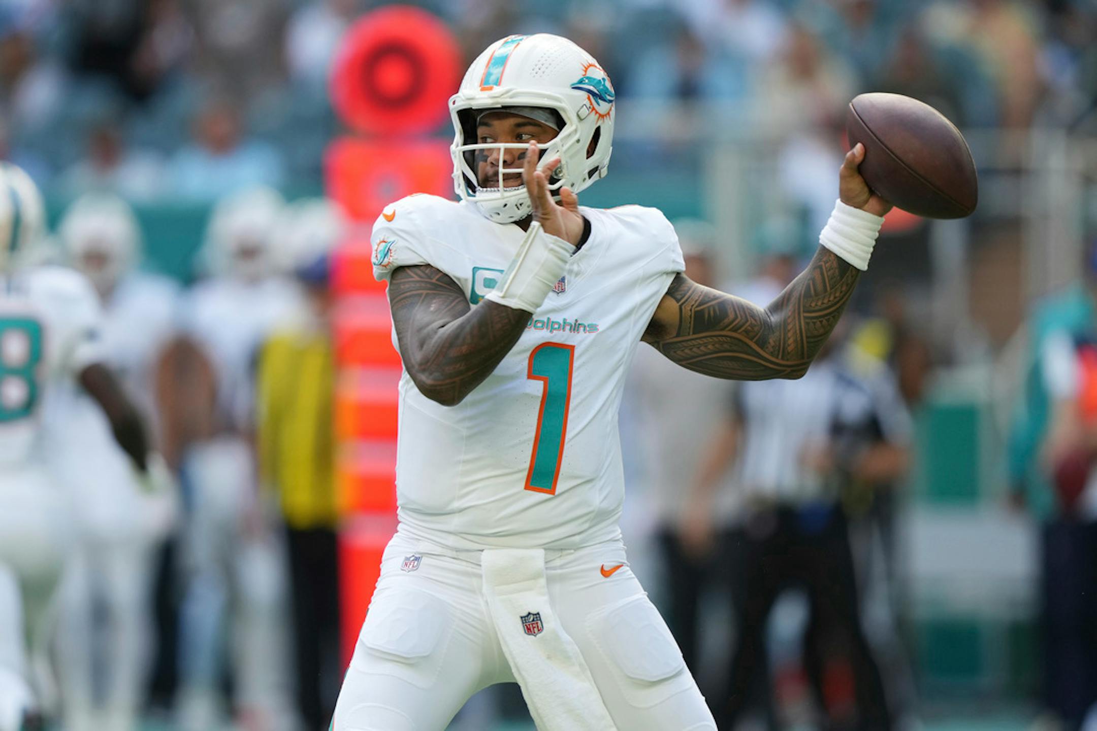 Tagovailoa, who moved to 7-0 in his career against New England, entered the game with a league-high 73.4% completion rate and went 29 for 40. He has 11 passing touchdowns and just one interception since returning from injured reserve in Week 8.