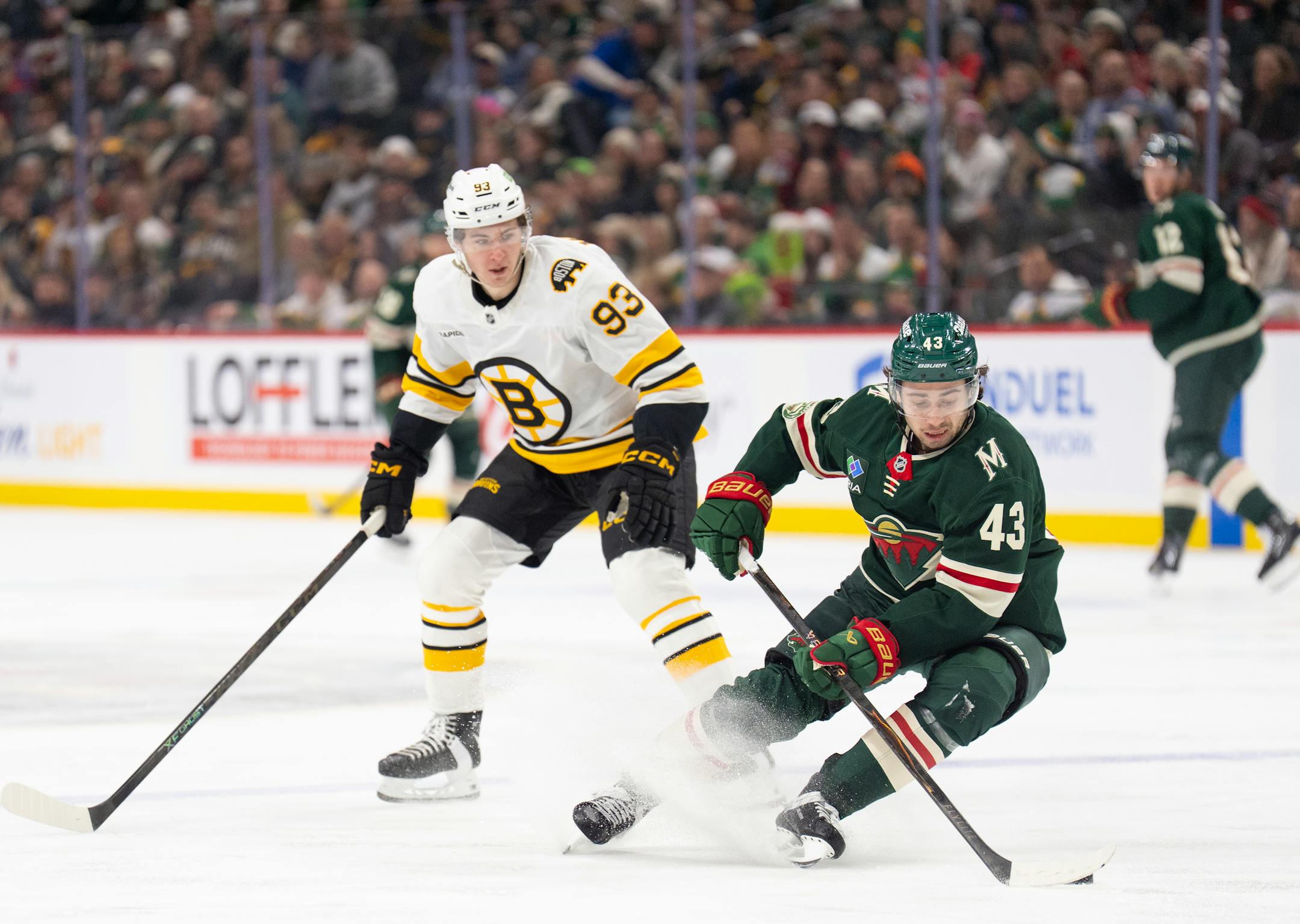 The two were together as the Wild’s top defensive duo, but it was Faber’s smooth transition to offense (à la Hughes) that was most impressive. Faber was on the ice for four Wild goals, assisting on two on the power play and getting off one shot that forced Bruins goalie Jeremy Swayman into one of the toughest of his 25 saves; Gustavsson stopped 29.