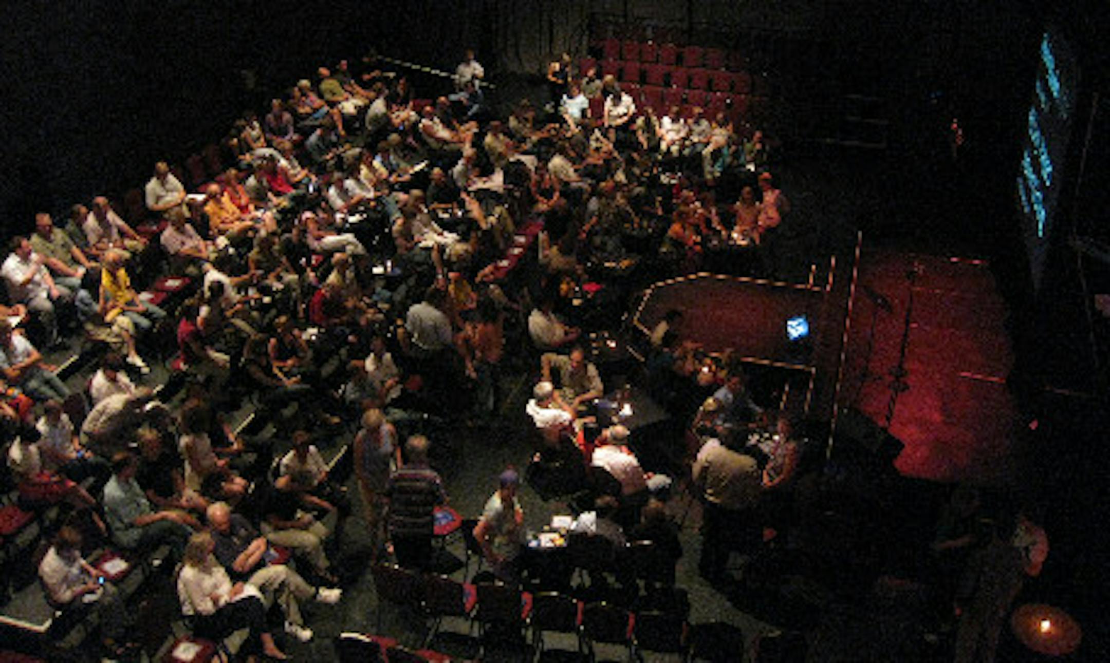 Here's photographic proof that Roadguy survived his onstage foray at Pecha Kucha Night #2. As mentioned in the previous post, PKN is an evening of PowerPoint presentations on speed -- 20 slides, 20 seconds per slide -- on topics such as art, technology, design and culture. As you can see by the title of my talk, I went with an area I know something about. The organizers of the event, to whom I am immensely grateful, say that the slides and audio will be posted online in about a week, so I'll hold off on describing my 400 seconds and let y'all just experience it when it's available to the masses (though I don't think you'll be able to see my laser-pointing or hear the crowd reactions).