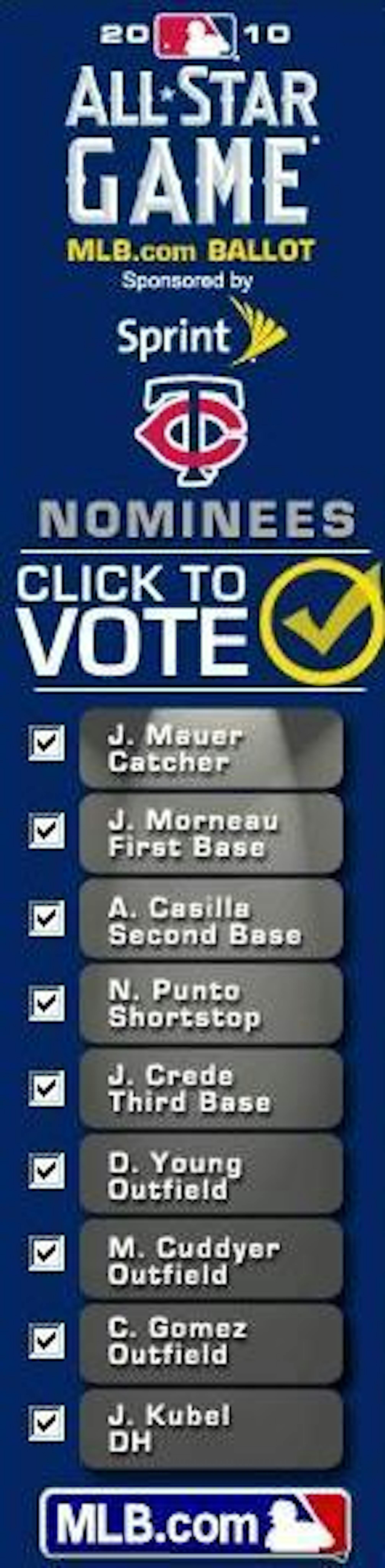 However, that ballot on the home page looks rather amusing. You know, unless you really think Alexi Casilla, Carlos Gomez and Joe Crede should represent the Twins at this year's midsummer classic.