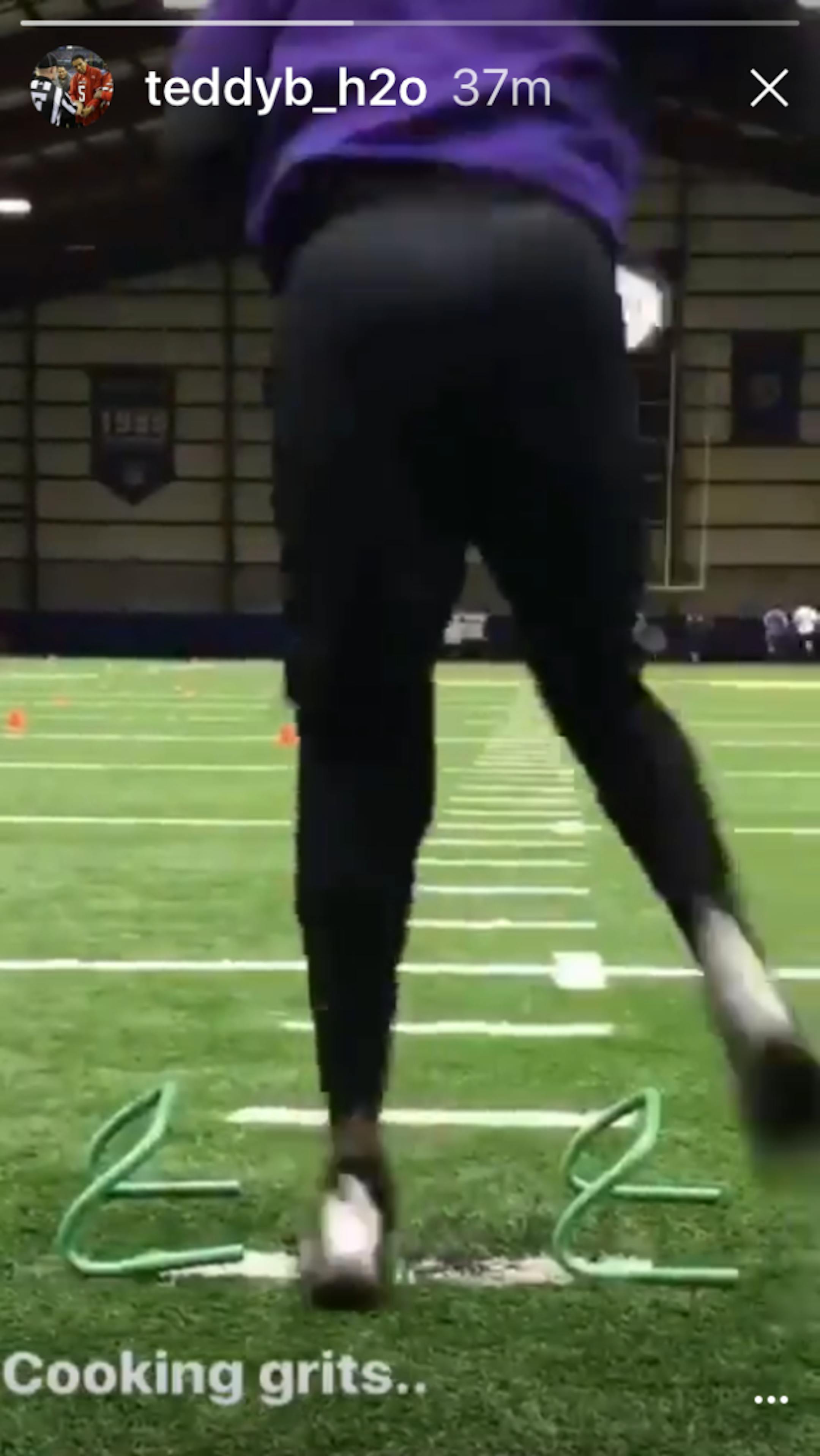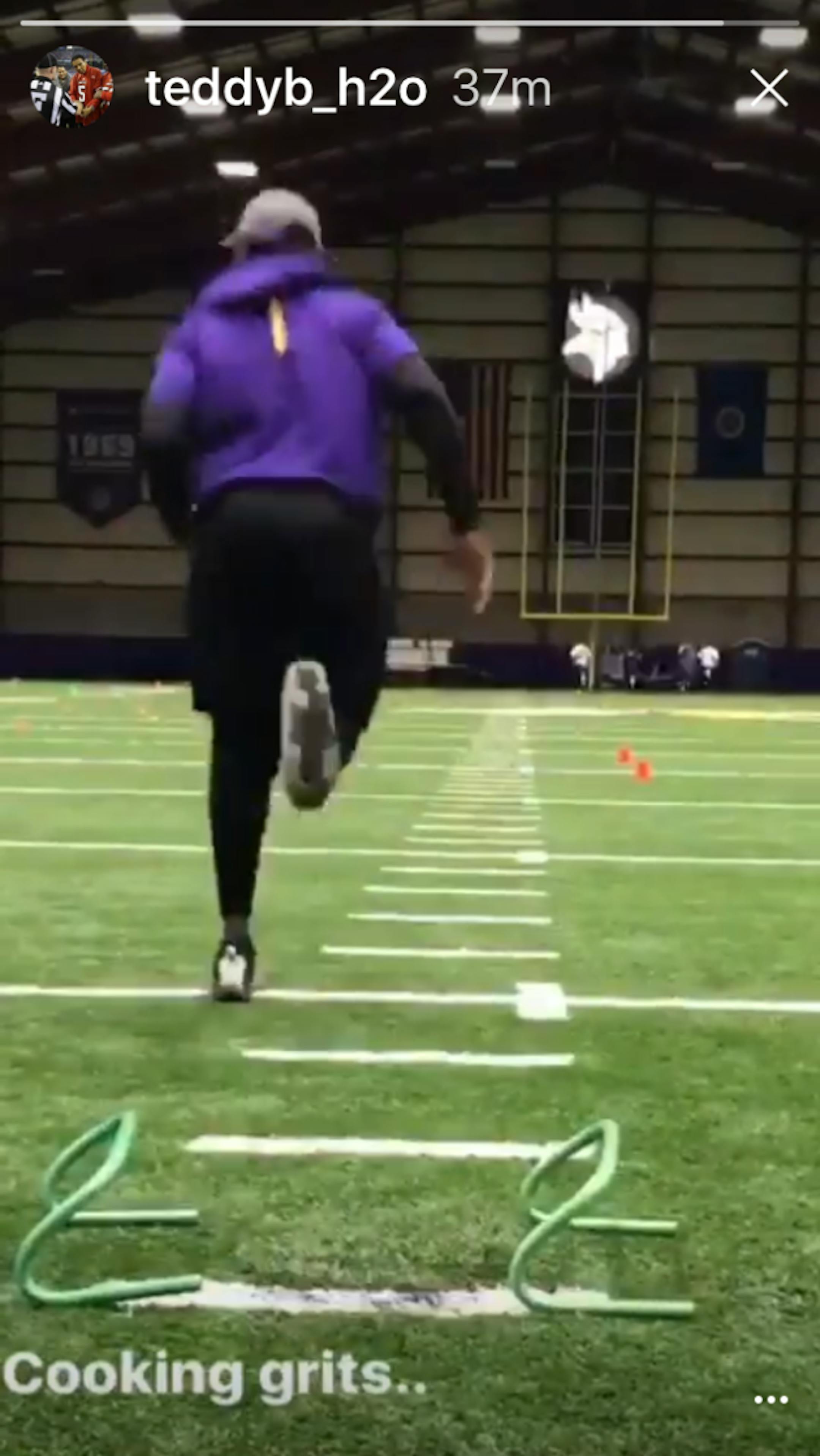 The Vikings quarterback posted video to his Instagram Story Thursday of himself breezing through agility drills at the team's Winter Park practice facility. The short video included the caption "Cooking grits.. ."