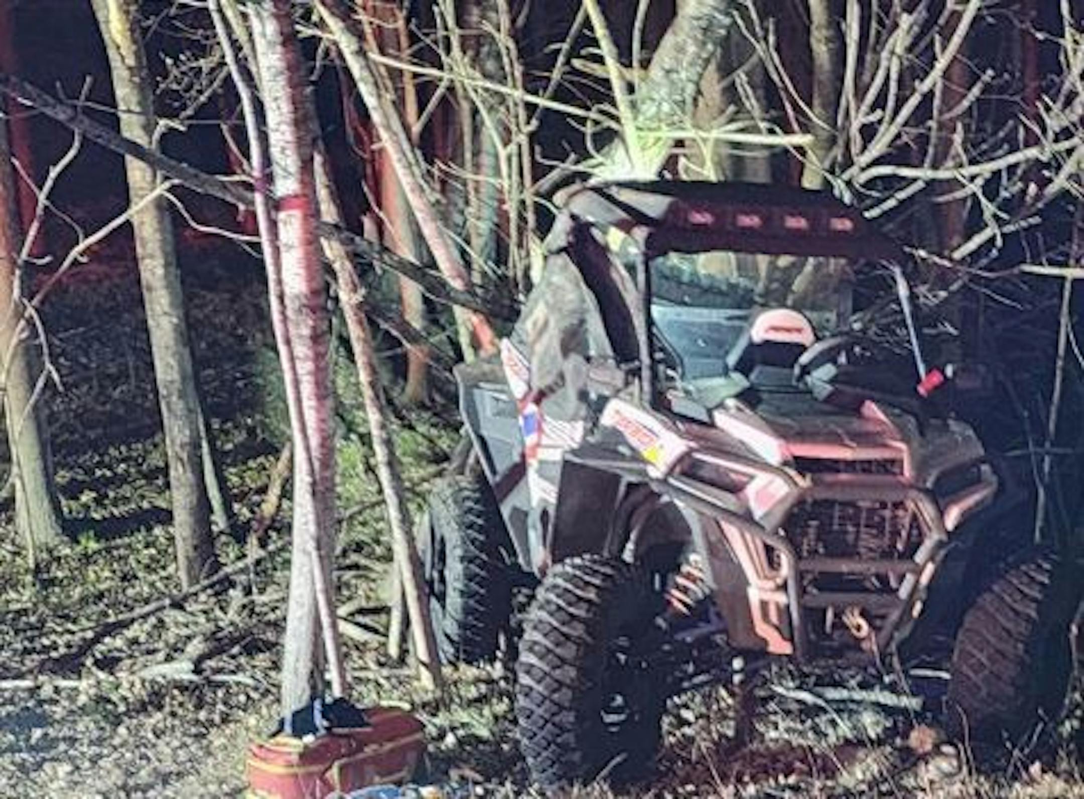 Marty Hinz said the off-road vehicle “snapped off three trees about 10 inches in diameter” before it came to rest about 20 feet from the end of his drive on N. Pike Lake Road.
