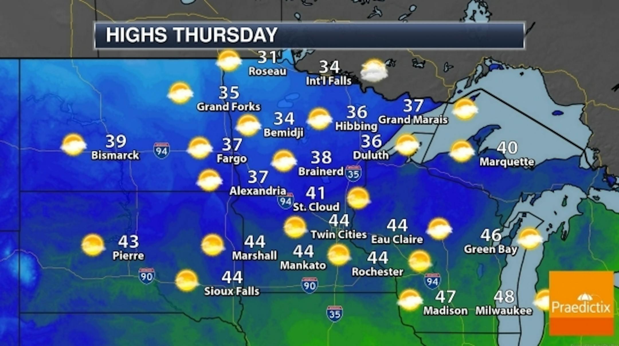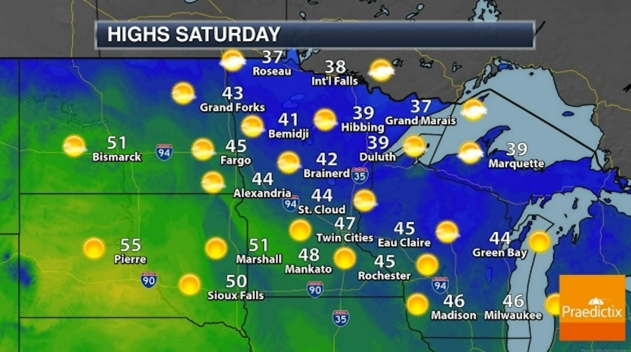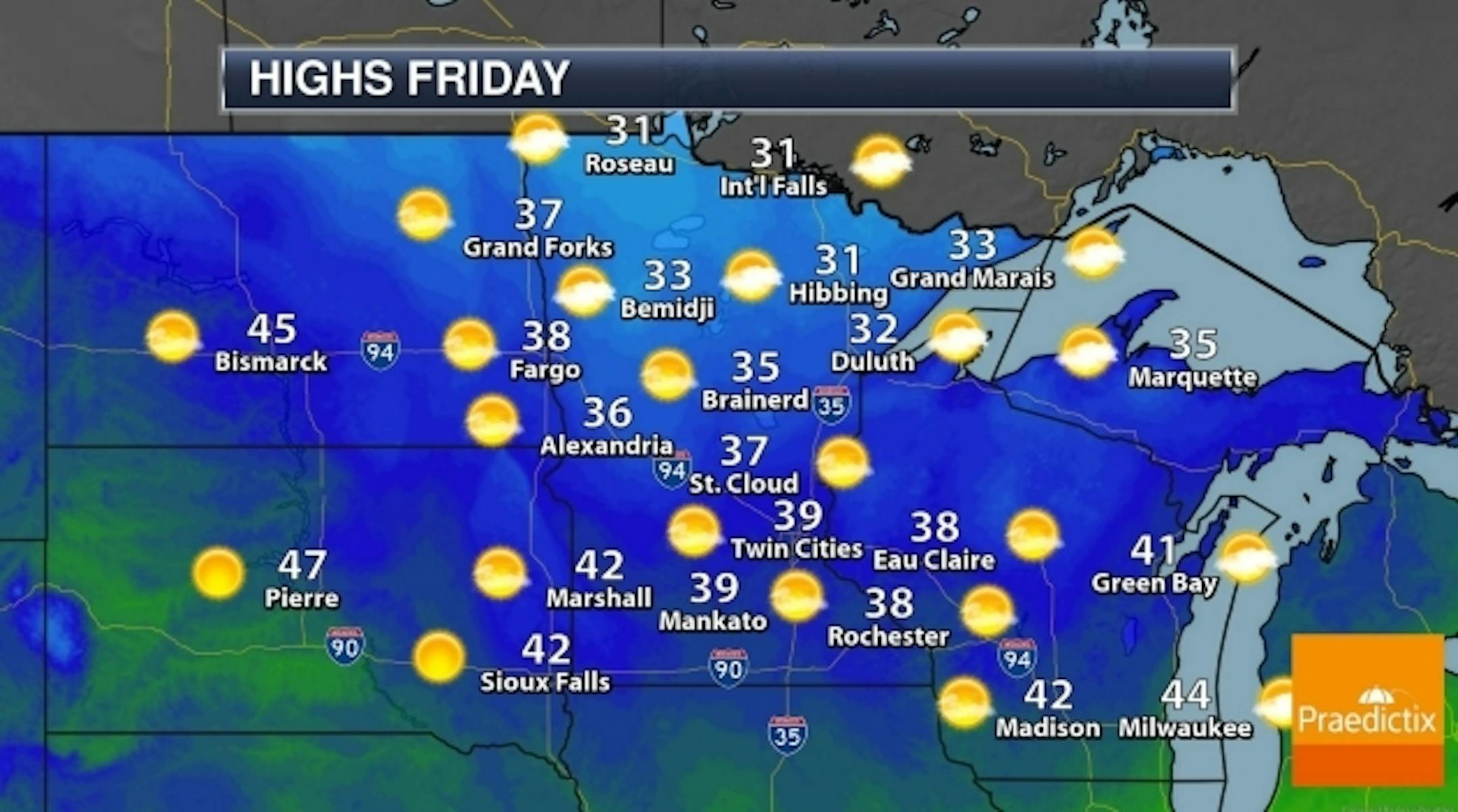 Warming Trend Into Saturday. With no snow on the ground the sun's energy (what little there is in late November) can go into heating up the air vs. melting snow, so 50F is possible again Saturday afternoon. Colder weather returns early next week, but nothing polar is in sight. Map sequence: Praedictix and AerisWeather.
