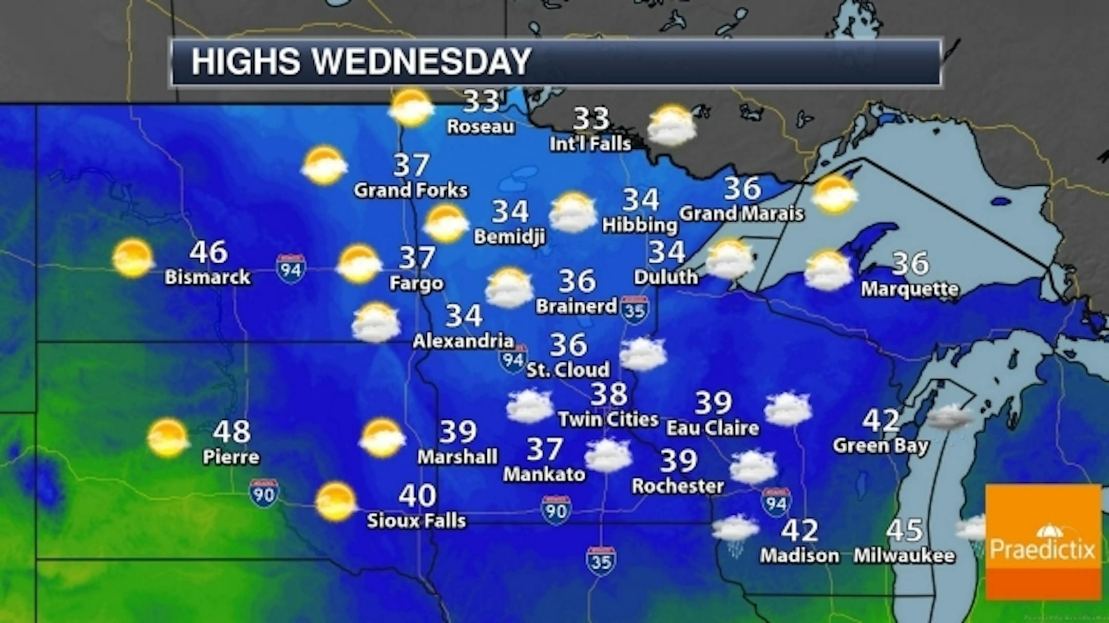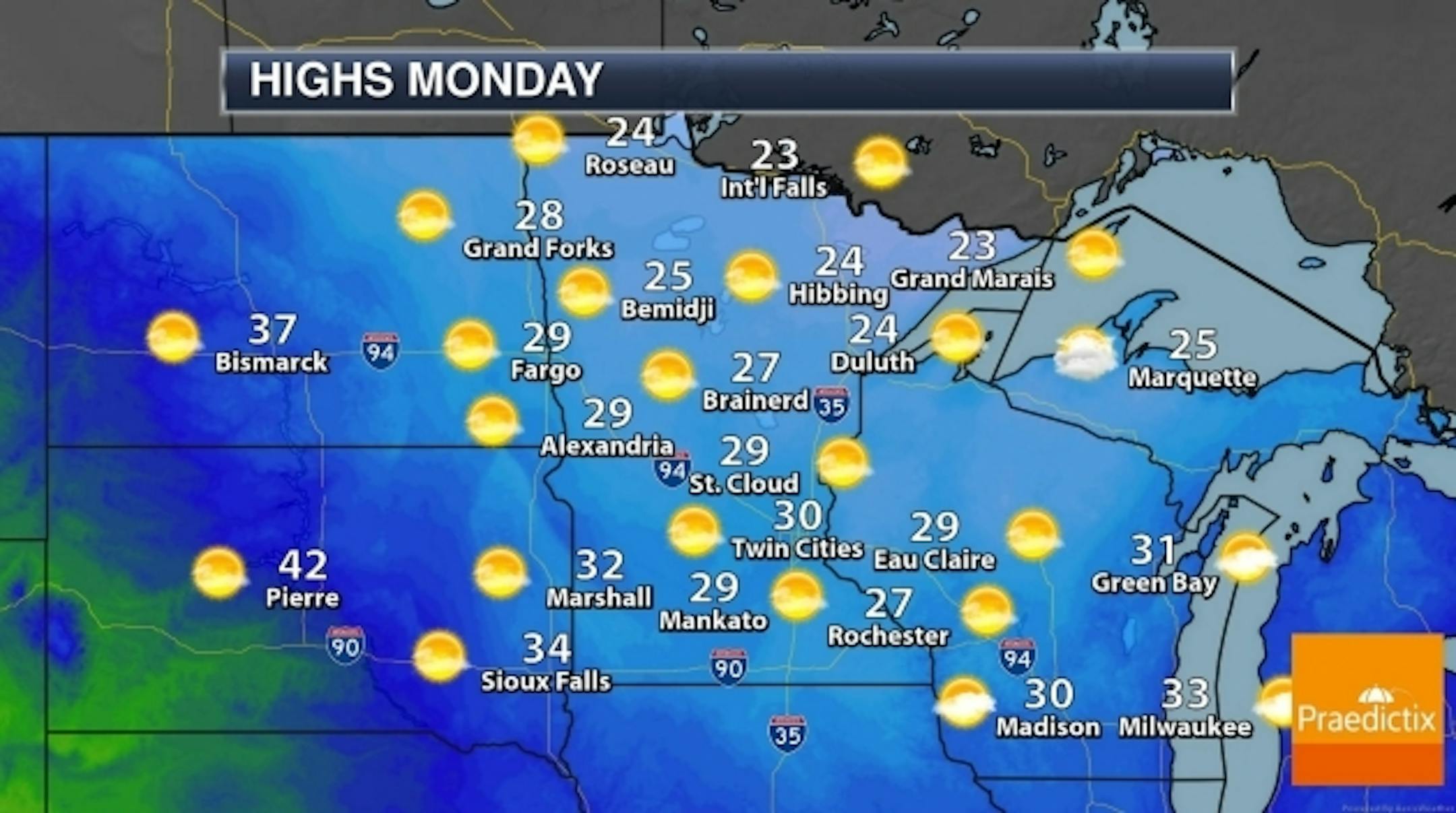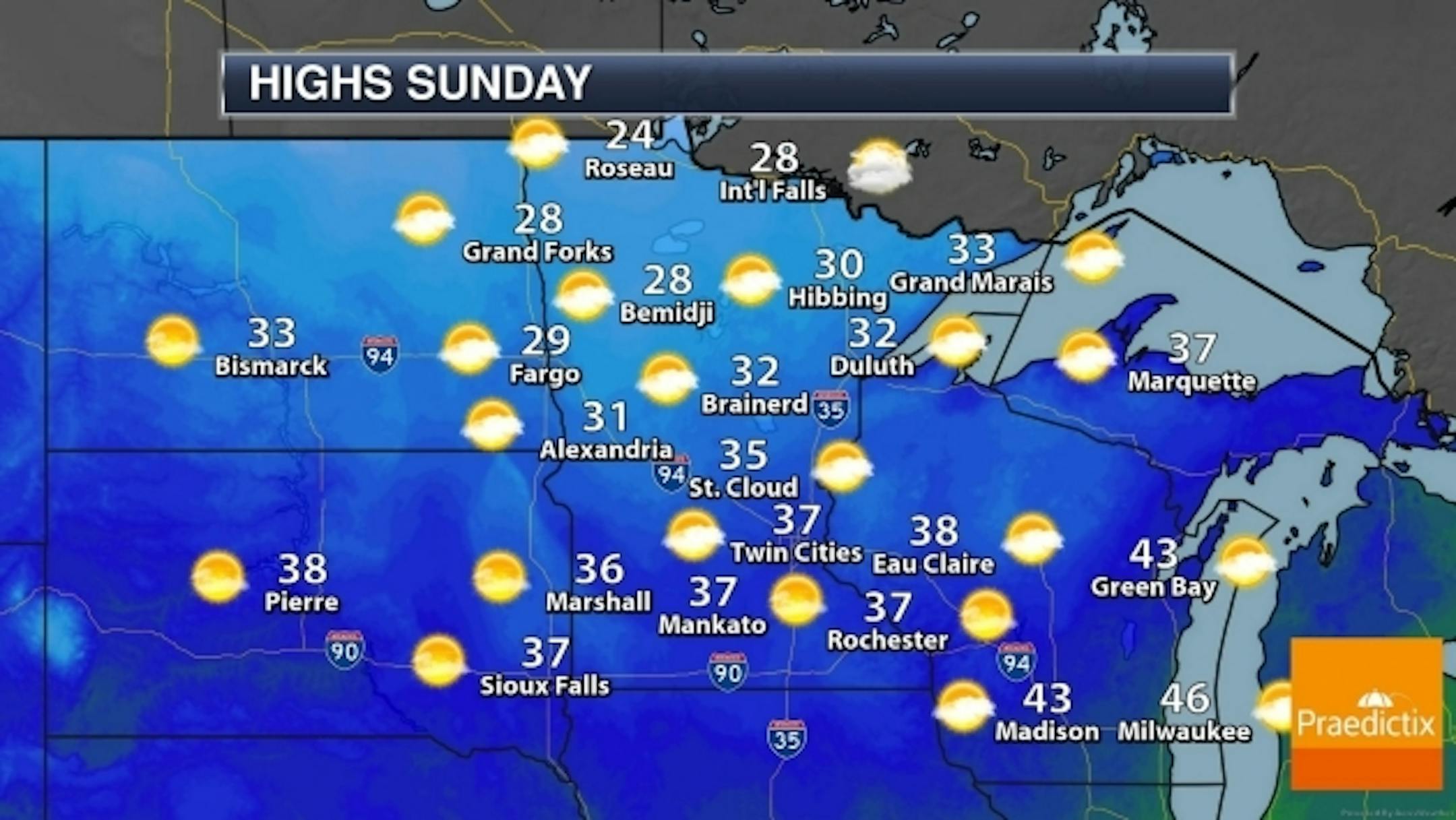 Warming Trend Into Saturday. With no snow on the ground the sun's energy (what little there is in late November) can go into heating up the air vs. melting snow, so 50F is possible again Saturday afternoon. Colder weather returns early next week, but nothing polar is in sight. Map sequence: Praedictix and AerisWeather.