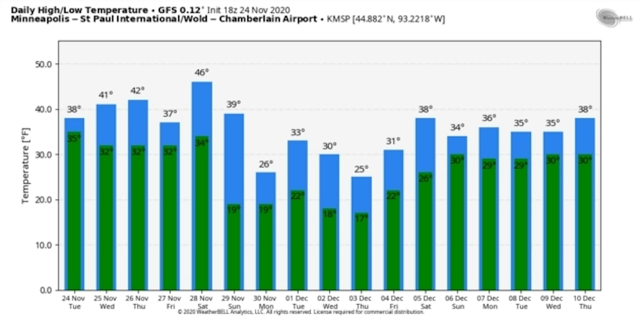 Relatively Mild November. Dr. Mark Seeley has the details in Minnesota WeatherTalk: "The recent moderation in temperature looks to prevail through the Thanksgiving holiday until the end of the month. As such it is likely that November 2020 will end up falling among the 20 warmest Novembers in state history, quite a remarkable turn around from last month, when we recorded one of the coldest Octobers in history. For the year 2020 so far Minnesota has recorded 7 warmer than normal months and 4 colder than normal months. Overall, the year is tracking to finish as another warmer than normal year but by less than 0.5 degrees F..."
