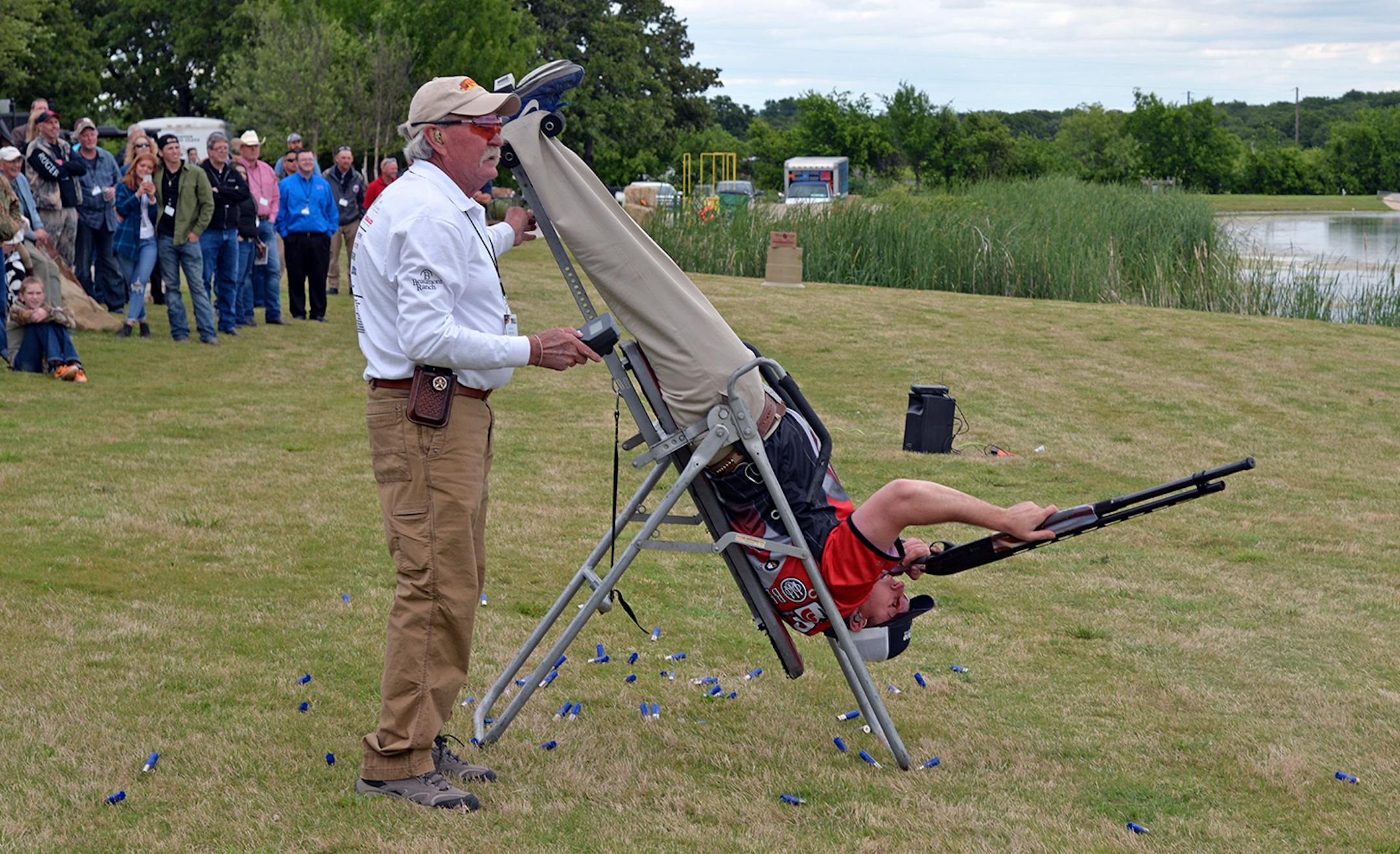 He'll fire while hanging upside down, jumping on a trampoline, holding a shotgun backward, behind his back, over his head and while standing 5 yards in front of oncoming, machine-fired clay targets. He'll rip through 350 to 400 shells per show and use a backup shotgun when the first one overheats.