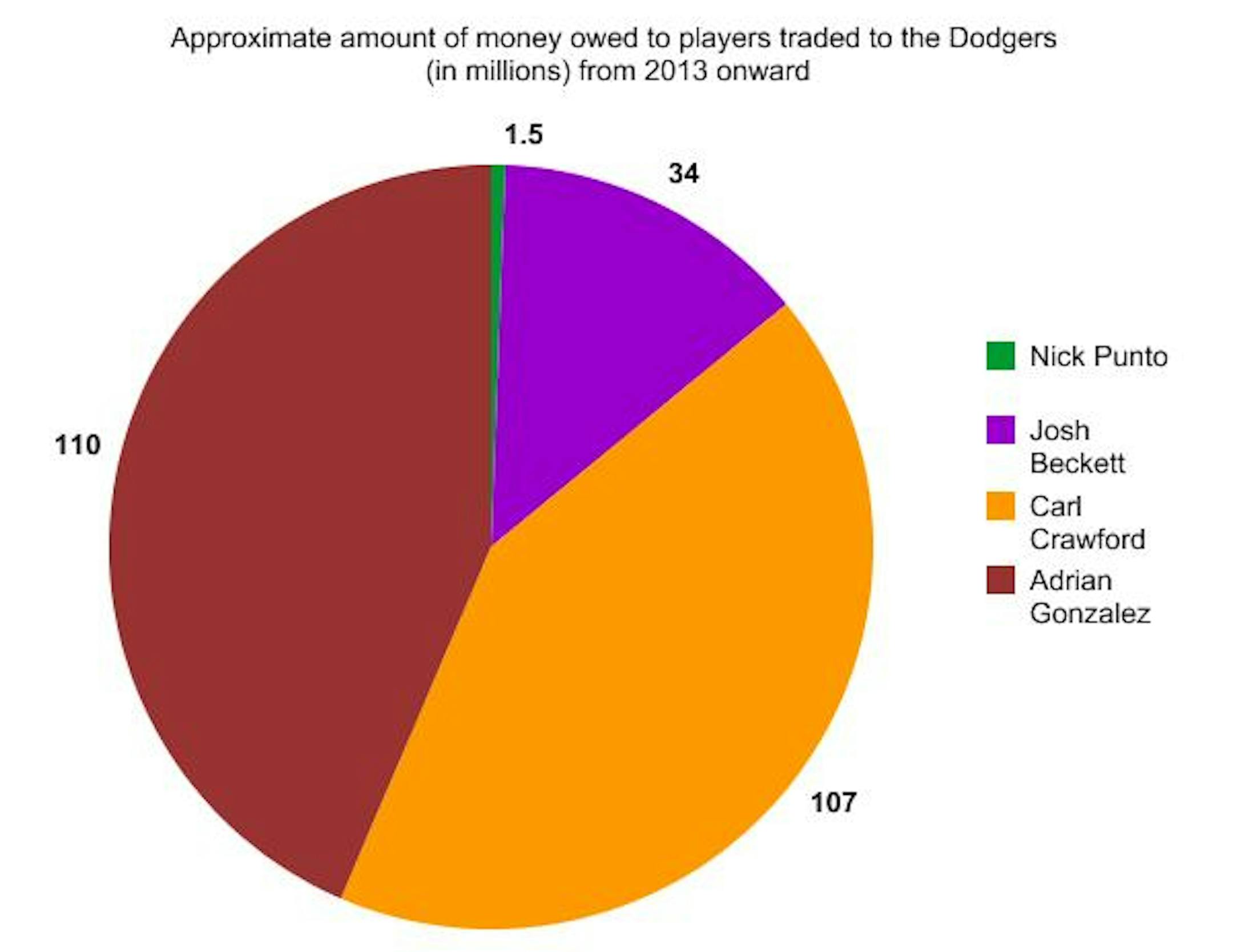 And our #cheapeningit takeaway: How that money owed is divided up among the four traded players: Adrian Gonzalez, Carl Crawford, Josh Beckett and Nick Punto. Please do enjoy this pie chart: