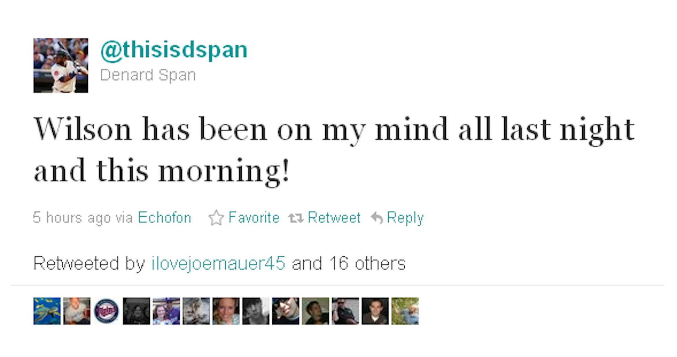 While the Penn State story has dominated our thoughts and many headlines, the Wilson Ramos story is bizarre, sad and so many other things. The latest: He is reportedly alive, and the car used in the abduction has been found. Naturally, Twins players have taken to Twitter in support of their former teammate. Here are a few of their tweets: