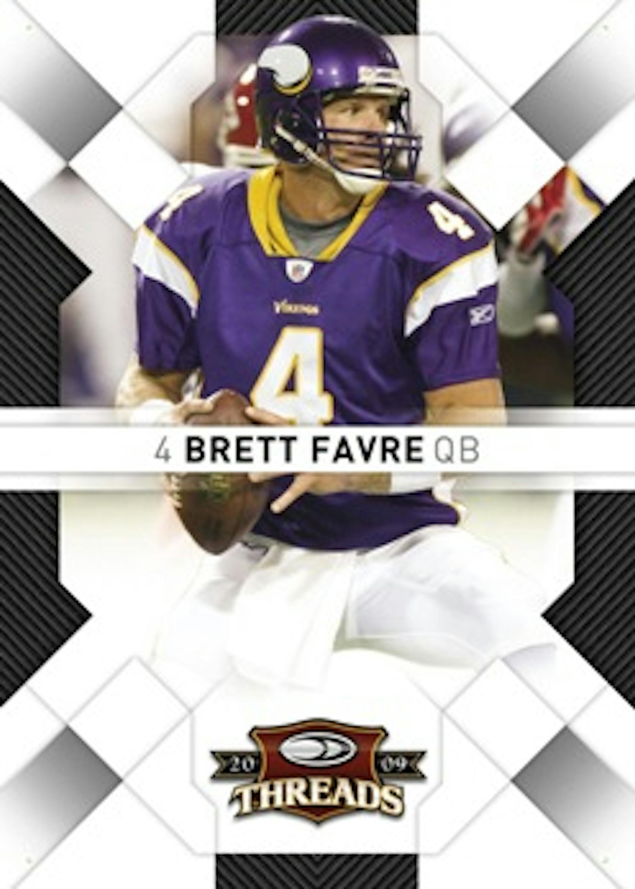 Panini America announced today that the company stopped the presses this weekend in order to include the FIRST trading card of Minnesota Viking's quarterback, Brett Favre, in its August, 2009 retail release of Donruss Threads Football. Favre pulled on the purple #4 jersey for the first time last Friday night in the Vikings preseason victory against the Kansas City Chiefs. Panini America dispatched a photographer to the Hubert H. Humphrey Metrodome with the sole intention of creating this historical card.