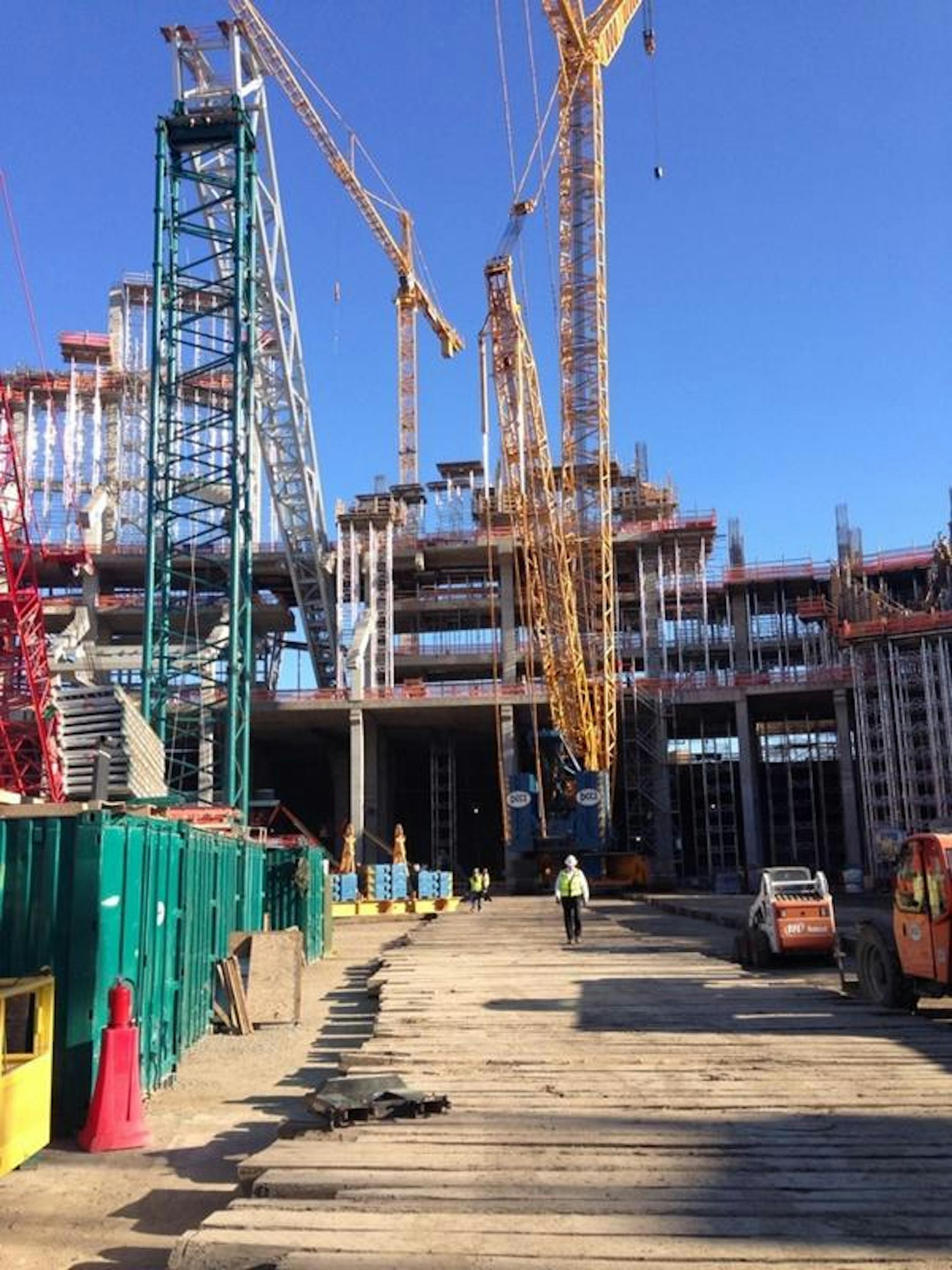 We took a tour of the new Vikings stadium today. It's not quite game-ready yet, but there are 13 cranes currently operational, including one that weighs 3 million pounds, so it should be finished any day now (or at least by July of 2016).