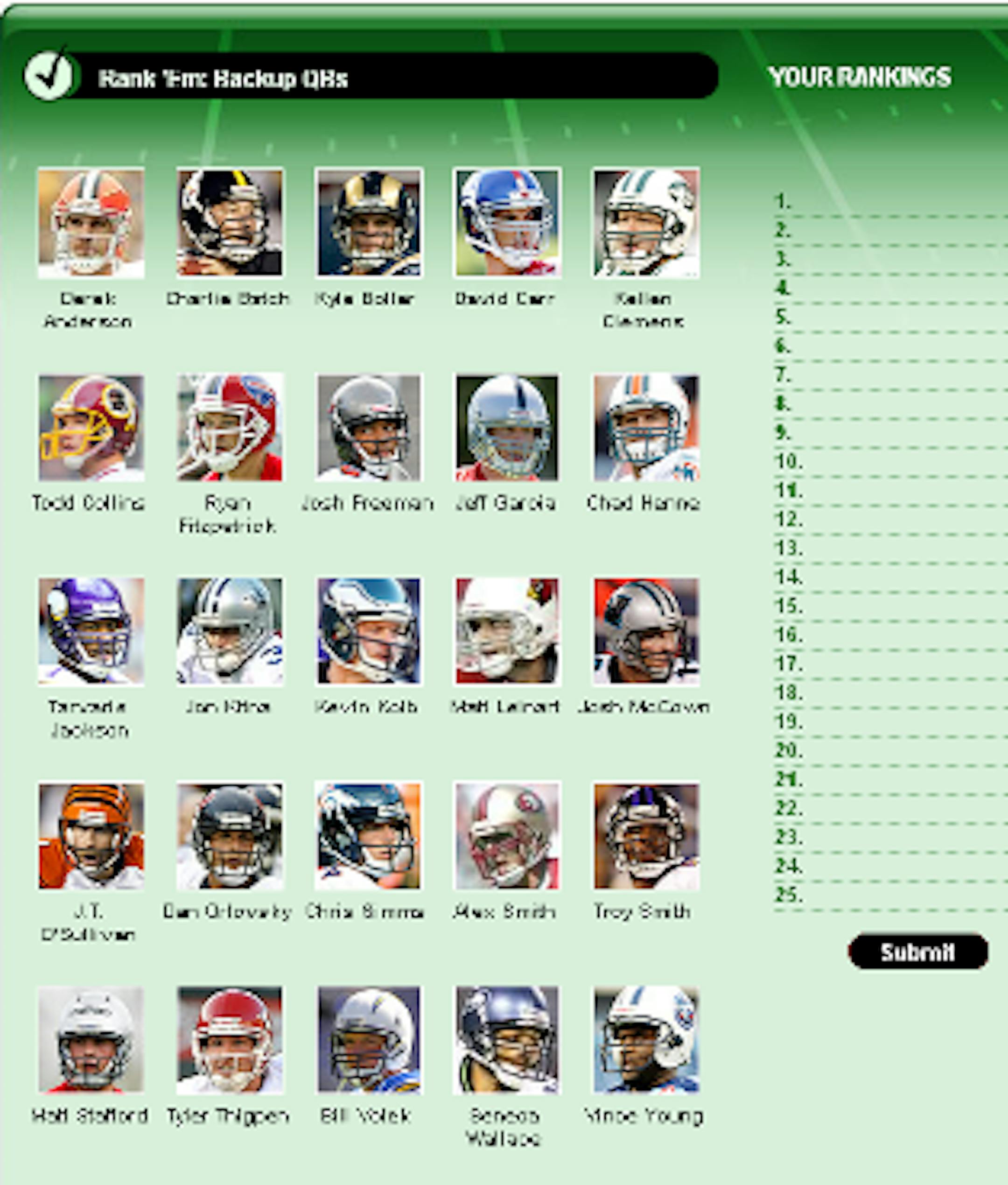 ESPN.com's main story this afternoon is about backup quarterbacks and the importance of having a good one. No argument there. Being the interactive leader that it is, ESPN also asks readers to rank the back up QBs in the league.