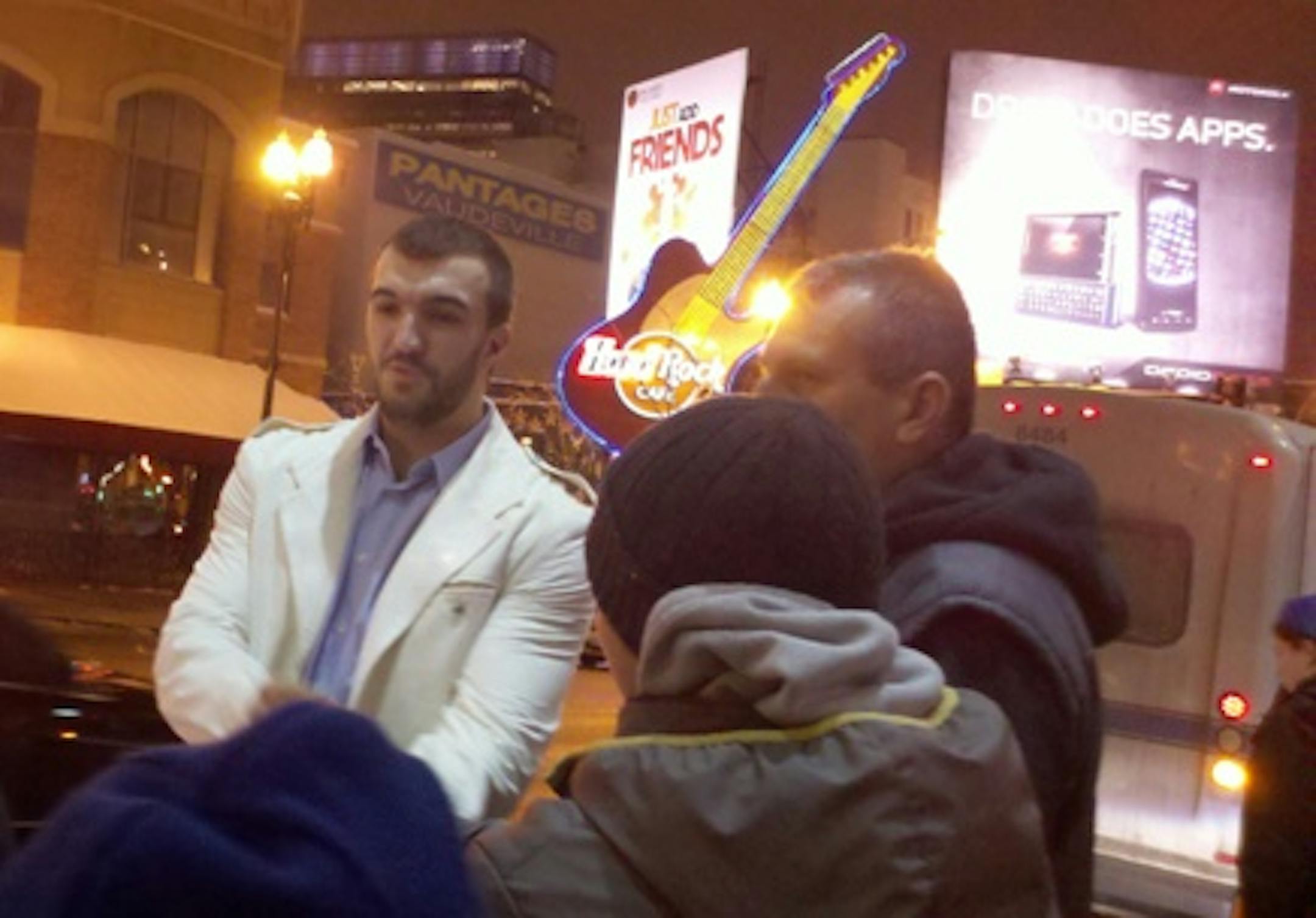 And also please enjoy this picture we took of injured Wolves big man Nikola Pekovic outside Target Center after last night's game.